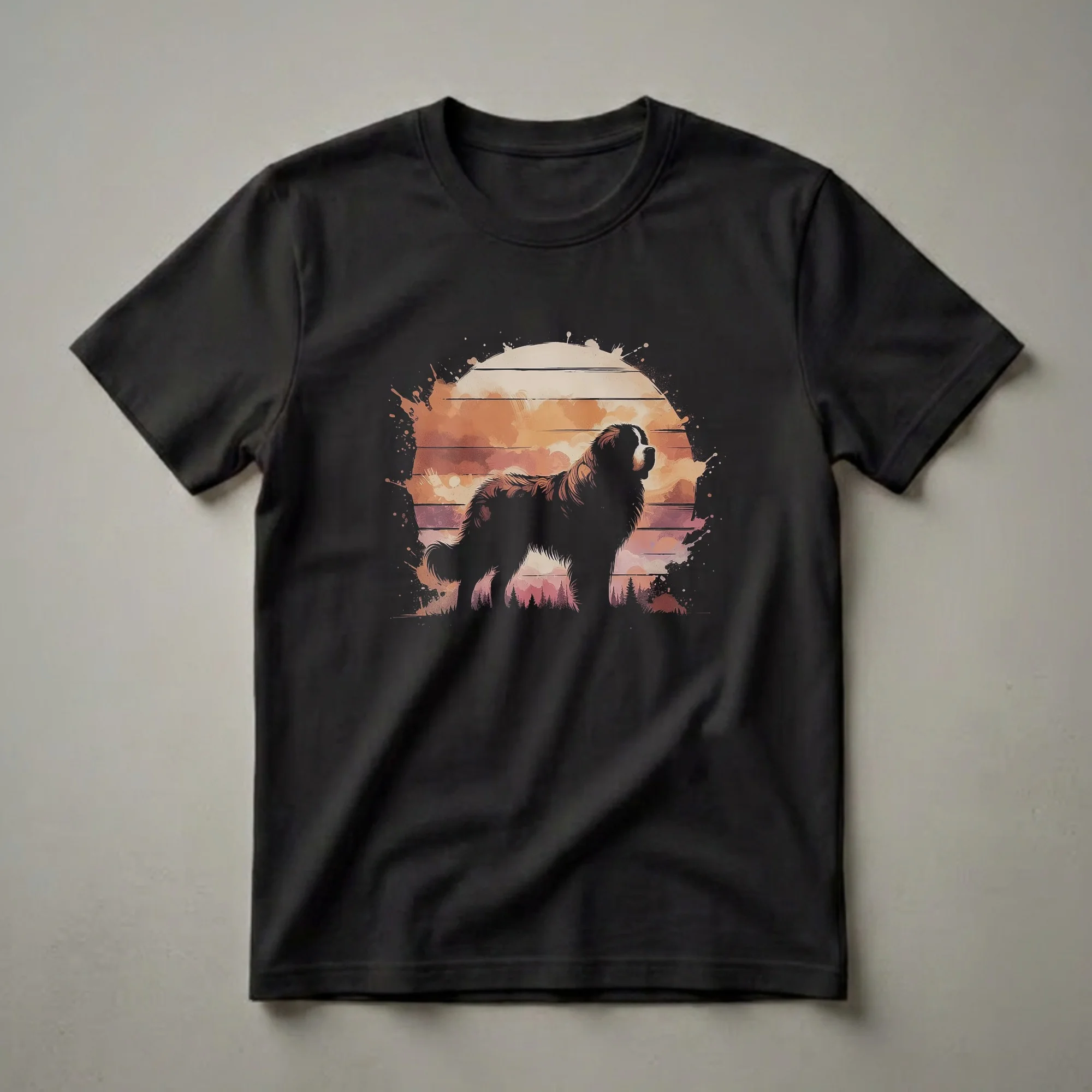 Saint Bernard owners who appreciate the breed's gentle giant nature will reach for this striking graphic tee. The design features a silhouette of a majestic Saint Bernard standing against a vibrant sunset, rendered in a vintage, artistic style. Splattered paint and distressed textures add to the unique, eye-catching aesthetic. This t-shirt is a wonderful way for any Saint Bernard mom or dad to express their affection for their beloved canine companion. The Saint Bernard, originally from the Swiss Alps, was bred as a rescue dog, known for its calm temperament and incredible strength. This shirt captures the serene beauty of the breed against a backdrop reminiscent of its mountainous origins. It makes a thoughtful gift for birthdays, holidays, or just because for the Saint Bernard lover in your life. Wear this tee on casual outings, to dog parks, or while relaxing at home, celebrating the bond you share with your furry friend.