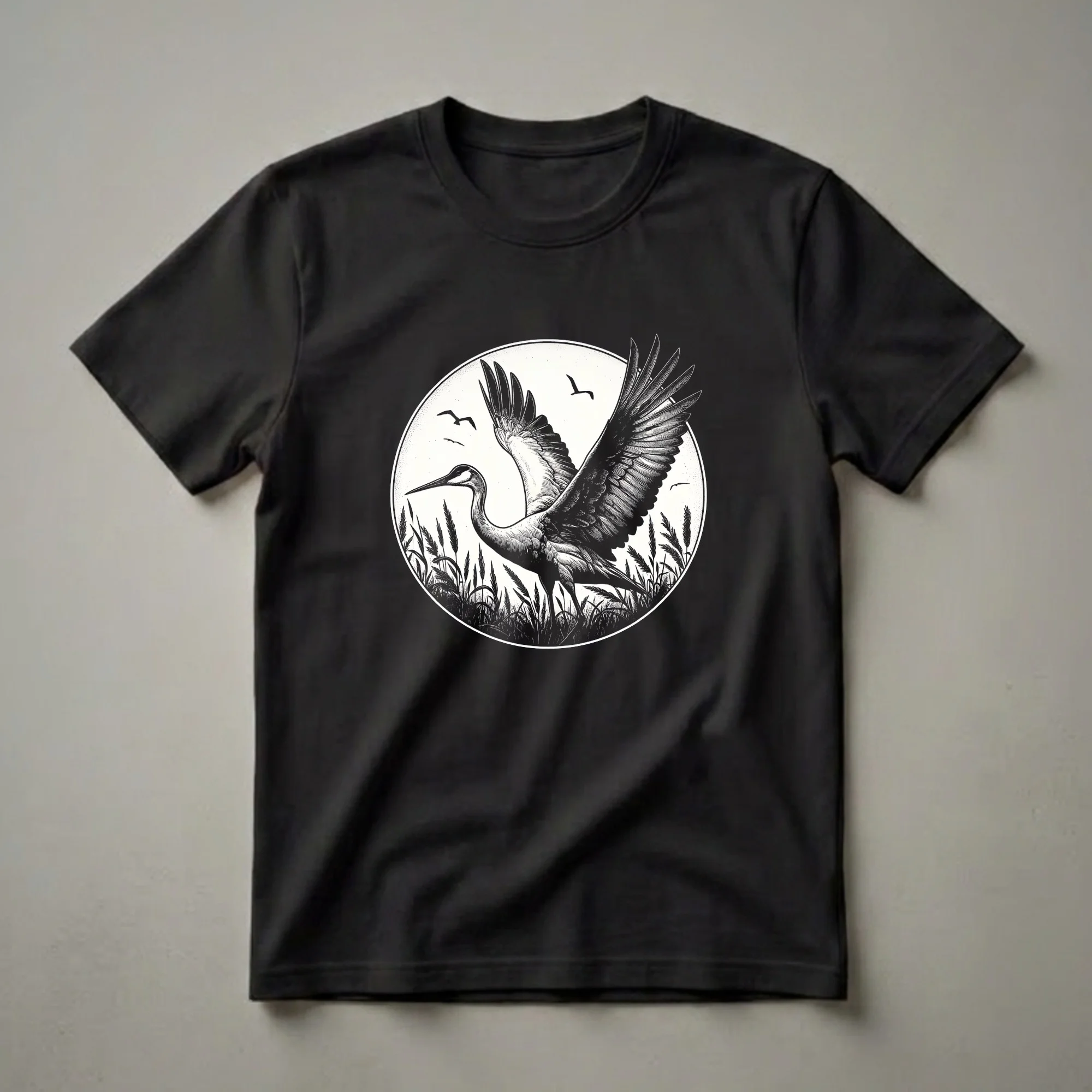 Nature lovers and birdwatchers will appreciate this striking graphic tee featuring a detailed vintage illustration of a Sandhill Crane in mid-flight. The artwork captures the majestic bird with its wings spread wide, soaring above a field of reeds. Smaller birds are depicted in the distance, adding depth to the scene within a classic oval frame. Sandhill Cranes are known for their impressive wingspans and distinctive calls, often found in wetlands and prairies across North America. This t-shirt is a thoughtful gift for anyone who cherishes the natural world and enjoys wildlife observation. It's a go-to tee for casual outings, hikes, or simply relaxing at home while celebrating your passion for avian beauty. Wear this shirt to express your connection to the wild and admire the artistry of these magnificent creatures.