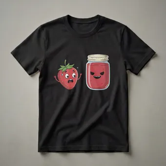 This eye-catching graphic tee showcases a humorous and slightly dark cartoon scene that plays on the common fate of fruit. On the left, a bright red strawberry with a green stem and leaves looks terrified, with sweat droplets on its brow and wide, panicked eyes. Its small arms are raised in a gesture of defense or plea. To its right stands a glass jar filled with vibrant red strawberry jam. The jam itself has a sinister face, complete with sharp, menacing teeth and narrowed, evil eyes, suggesting a dark fate for the strawberry. This design taps into the inherent humor of food processing, presenting a playful yet unsettling narrative. It's a conversation starter for anyone who appreciates dark comedy and quirky food-related humor. This shirt makes a thoughtful gift for friends who enjoy a good laugh and unique graphic tees, perhaps for a game night or a casual brunch. The contrast between the innocent strawberry and the villainous jam jar creates a memorable visual that resonates with fans of dark humor and novelty apparel.