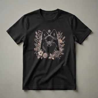 Schipperke owners who appreciate artistic flair will reach for this distinctive t-shirt. The design features a striking, detailed drawing of a black Schipperke's face, rendered in a monochromatic, vintage style. This canine portrait is artfully framed by a lush wreath composed of botanical elements, including delicate flowers, textured pinecones, and clusters of berries. The Schipperke, a small Belgian barge dog, is known for its fox-like appearance and alert, curious nature. This graphic tee is a wonderful way for Schipperke moms and dads to express their affection for their spirited companions. It makes a thoughtful gift for birthdays or holidays for anyone who adores this unique breed. Wear this shirt to your next dog park visit or casual outing to spark conversations with fellow dog enthusiasts.