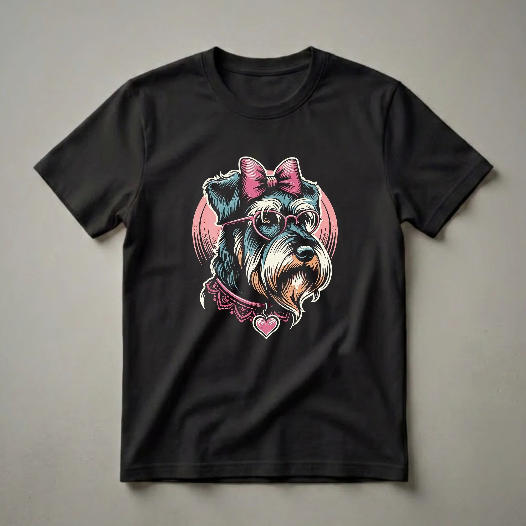 - Features a stylish Schnauzer illustration with heart glasses and a bow.