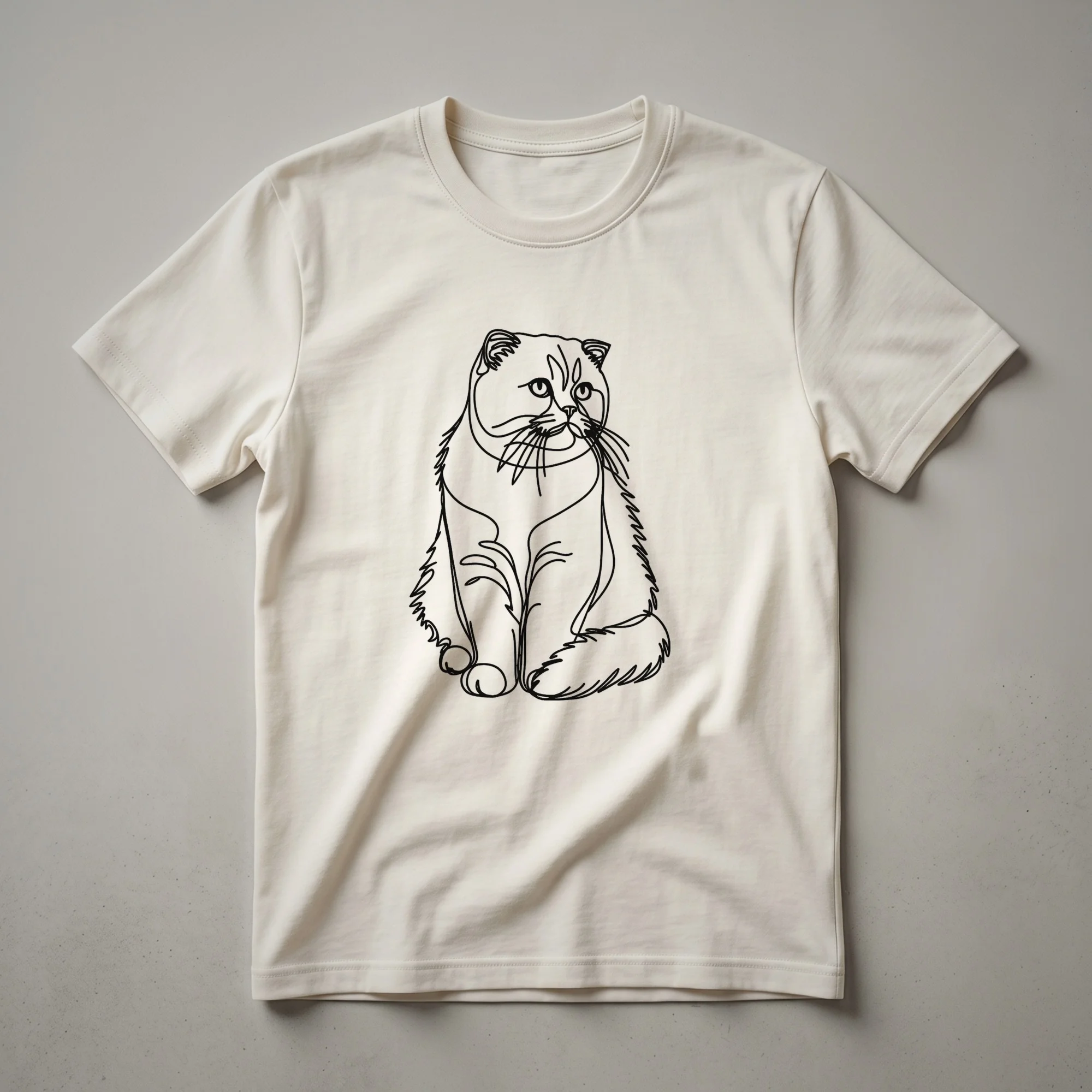 - Minimalist line art t-shirt featuring a Scottish Fold cat face.