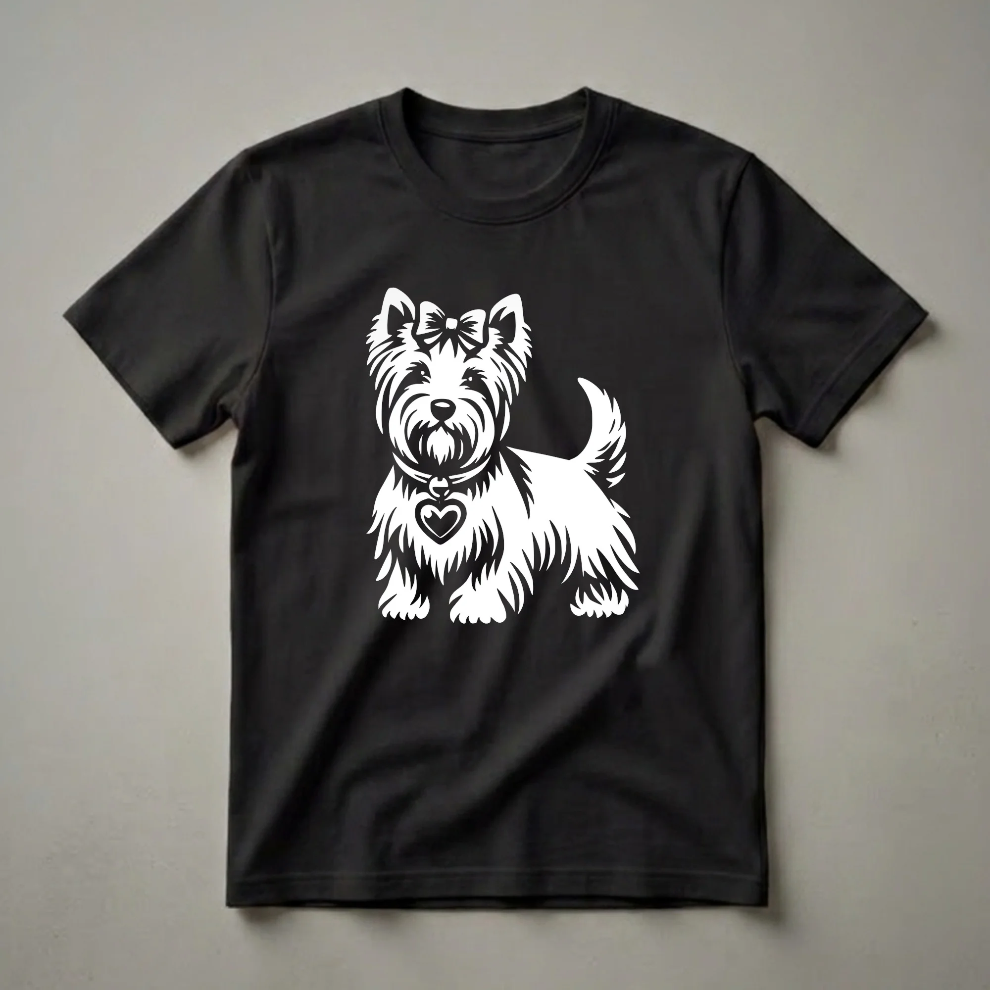 Show your deep affection for your spirited Scottish Terrier with this charming graphic t-shirt featuring a sweet Scottie and heart design.This graphic tee features a striking white silhouette of a Scottish Terrier, complete with a sweet bow atop its head and a heart-shaped pendant hanging from its collar. The design captures the breed's distinctive wiry coat and alert expression, making it instantly recognizable to any enthusiast. Scottish Terriers, often called 'Scotties,' are known for their independent nature and loyalty, originating from Scotland where they were bred to hunt vermin. This shirt is a thoughtful gift for the Scottish Terrier mom who cherishes her furry companion. It's a staple in the collection for anyone who wants to showcase their devotion to their four-legged family member. Wear this tee to your next dog park visit or casual outing to spark conversations with fellow dog lovers. It’s a comfortable and stylish way to express your bond with your Scottish Terrier, celebrating the joy they bring into your life.