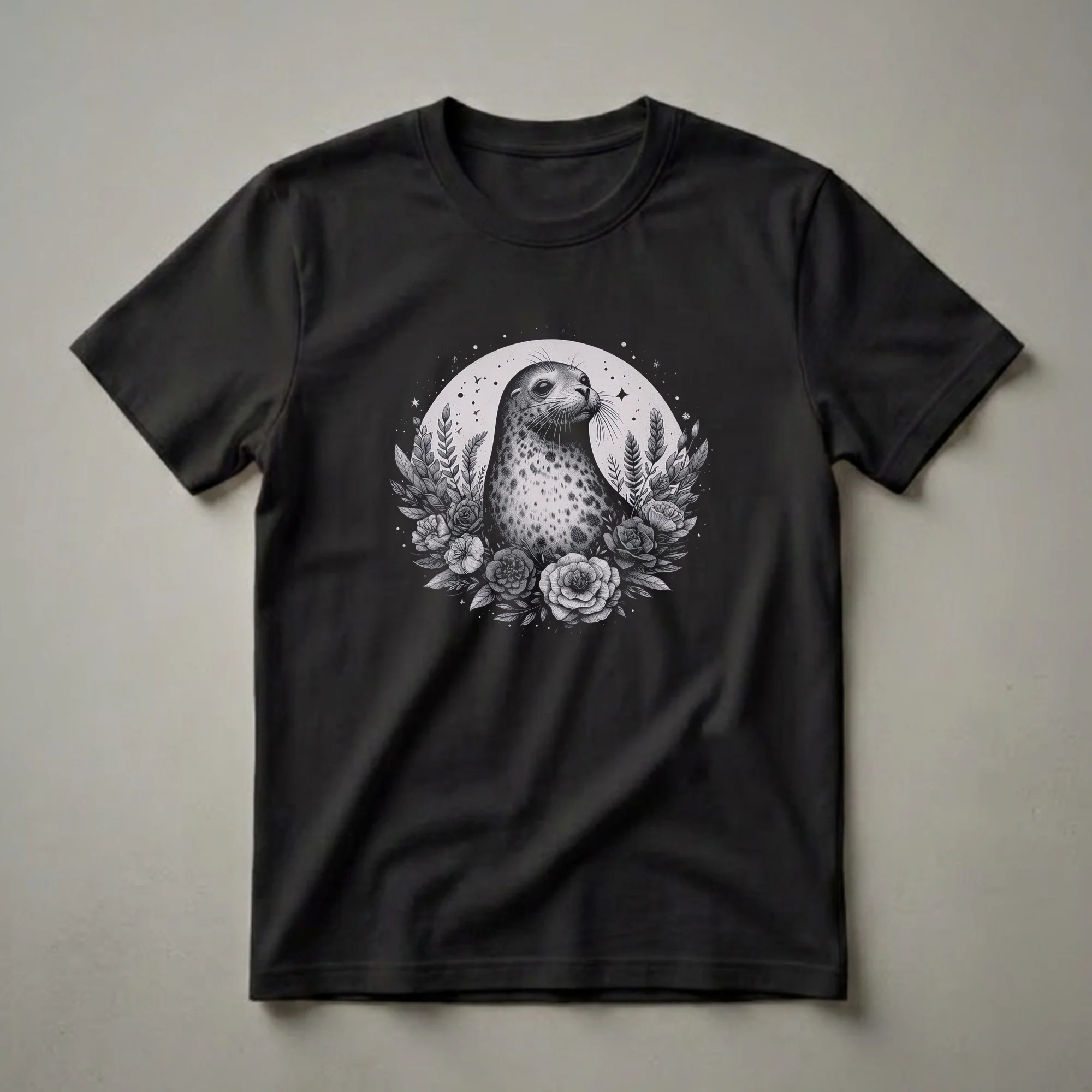 Ocean lovers will appreciate the intricate detail of this graphic tee, featuring a realistic portrayal of a seal's head and upper body. The artwork is rendered in a monochromatic, sketch-like style, giving it a timeless and artistic feel. Surrounding the seal is a wreath of detailed flowers and foliage, creating a beautiful contrast between the marine mammal and botanical elements. Above the seal, a textured circle suggests a moon or celestial body, complete with small stars and silhouetted birds in flight, adding a touch of whimsy and depth to the design. Seals, known for their playful nature and sleek bodies, are found in various marine environments worldwide, from Arctic waters to temperate coastlines. This t-shirt works well for anyone who admires these fascinating creatures and the ocean they inhabit. It makes a thoughtful gift for marine biologists, divers, or anyone who feels a connection to the sea. Wear this unique shirt to your next beach outing or casual gathering to spark conversations about marine conservation and the beauty of the ocean.