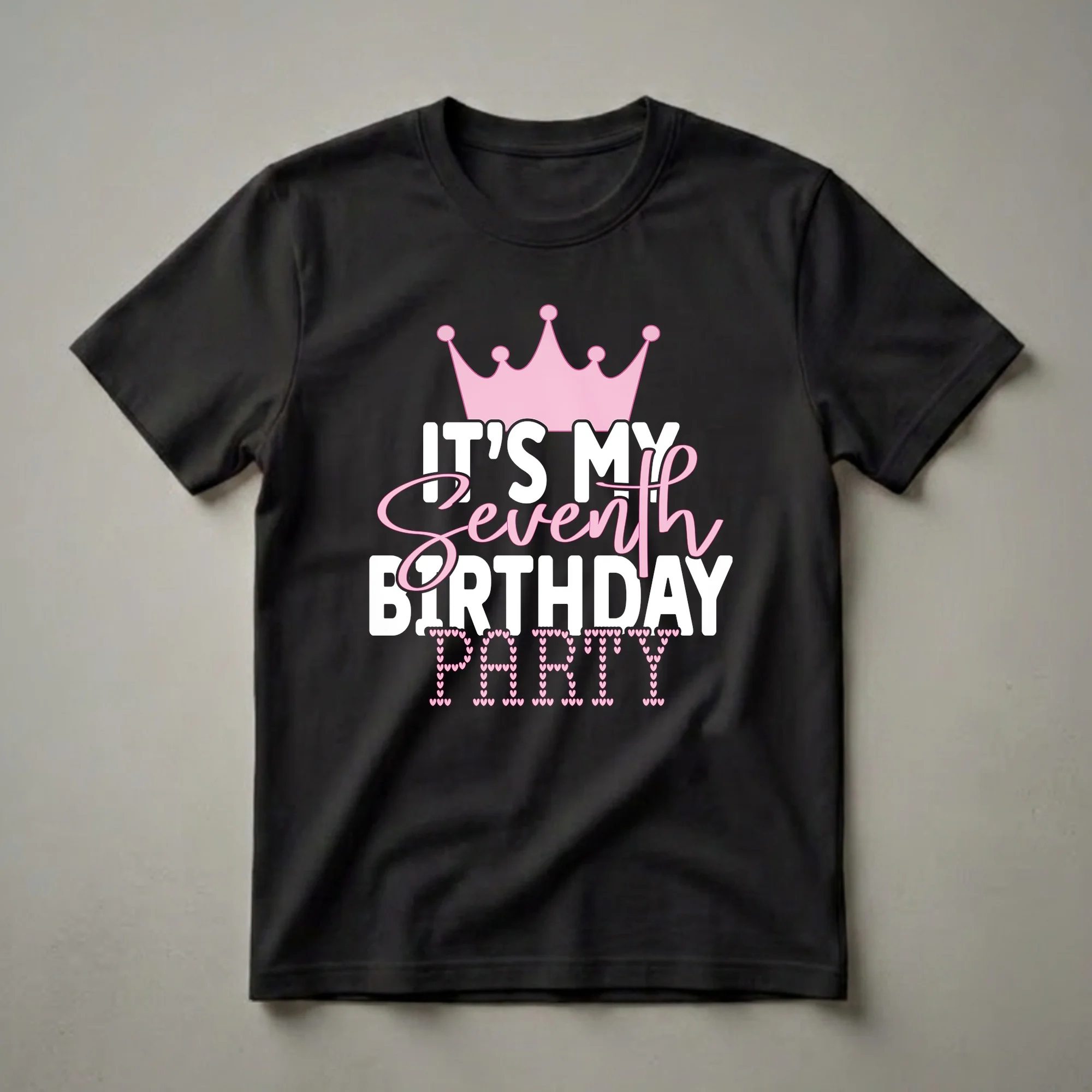 Seven is a magical age, marking a significant step into childhood, and this birthday queen tee is ready to celebrate. This eye-catching graphic shirt features a vibrant pink crown perched above bold white text that reads 'IT'S MY SEVENTH BIRTHDAY'. The word 'PARTY' is playfully spelled out below using a cascade of small pink hearts, adding a sweet, festive touch. This t-shirt is a wonderful way for any 7-year-old girl to announce her special day and feel like royalty. It's a thoughtful gift for a daughter, niece, or granddaughter turning seven, making her birthday celebration even more memorable. She will reach for this shirt to wear to her birthday party, to school on her birthday, or any time she wants to feel celebrated. The design captures the excitement and joy of reaching this milestone age, making it a cherished keepsake from her seventh birthday. This shirt is a fantastic addition to any birthday outfit.