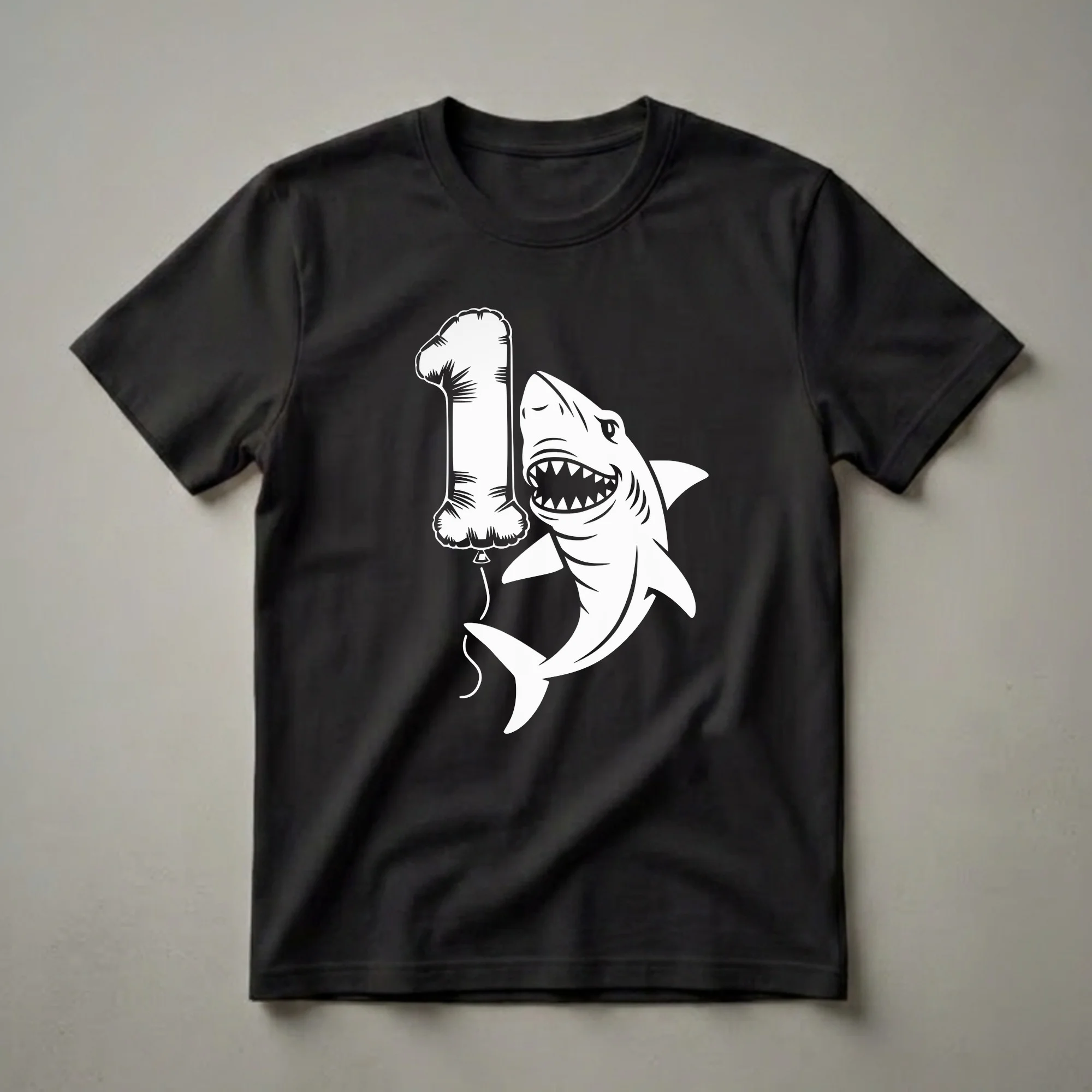 Turning one is a momentous occasion, and this shark-themed birthday shirt captures the excitement perfectly for any little one. The graphic features a stylized shark with its mouth open, revealing sharp teeth, and a playful expression. It's holding onto a large balloon shaped like the number '1' with a string. Sharks, known for their powerful presence in the ocean, are fascinating creatures for young children. This t-shirt is suited for toddlers celebrating their very first birthday, making it a memorable piece of apparel for the special day. It's a thoughtful gift for a 1-year-old who is fascinated by marine life or simply loves a fun, bold design. Imagine your little one wearing this tee for their birthday party, cake smash photos, or just for a day out. This shirt is a fantastic way to commemorate a child's first year, combining a popular animal with a classic birthday symbol. It's a go-to tee for any toddler's birthday celebration, ensuring they look adorable and feel festive.