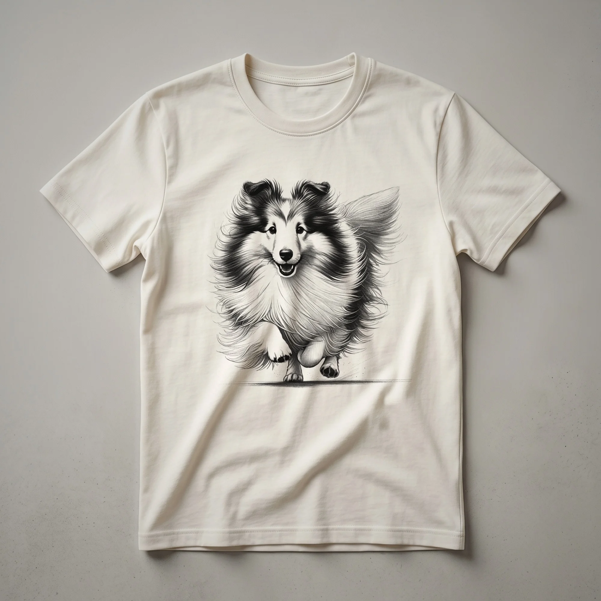 - A Sheltie running graphic tee celebrating the breed's agility and energy.