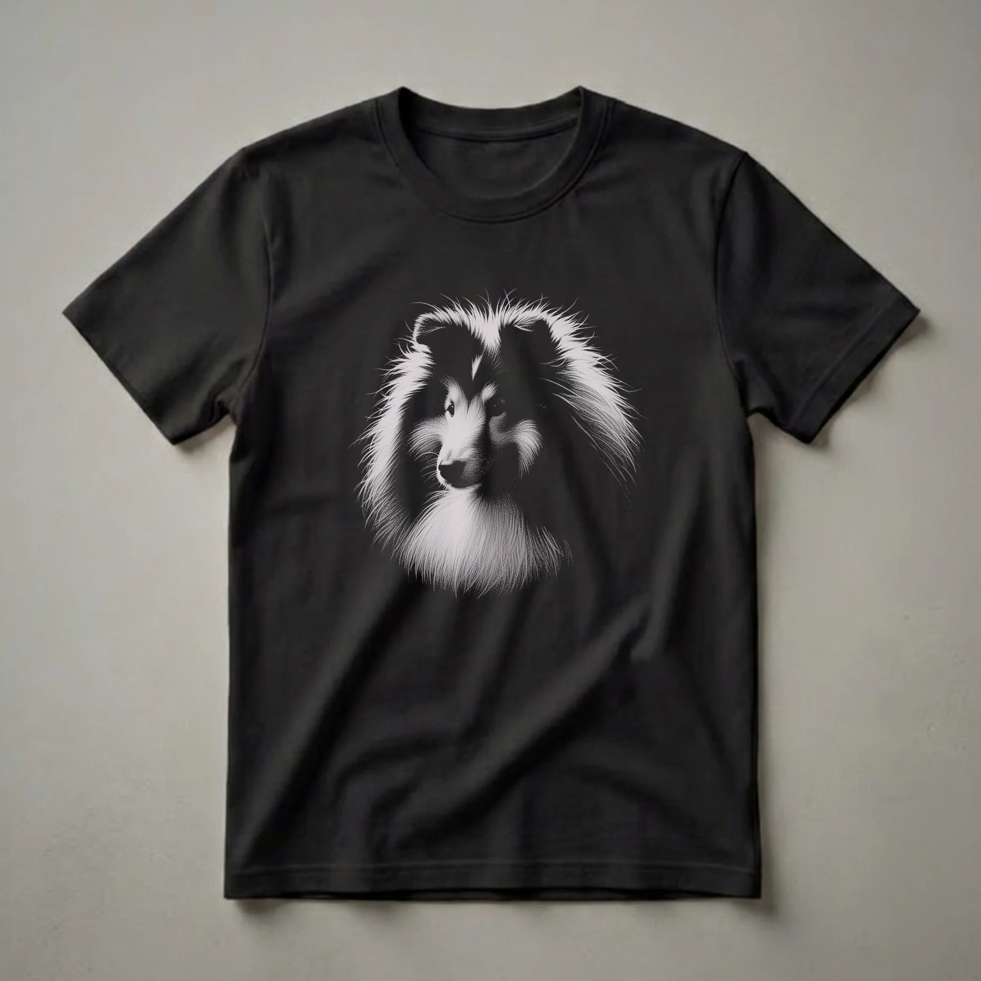 Sheltie enthusiasts will appreciate this artful graphic tee showcasing a detailed vintage drawing of a Shetland Sheepdog's noble head. This striking graphic tee features a detailed vintage-style drawing of a Sheltie's head, rendered in high contrast against a dark background. The artwork captures the breed's characteristic fluffy mane and alert expression, making it a standout piece for any dog lover. Shetland Sheepdogs, often called Shelties, originated in the Shetland Islands of Scotland, where they were bred as herding dogs. Their agility and trainability made them valuable farm animals, and today they are cherished as loyal companions. This t-shirt is a wonderful way for a Sheltie mom or dad to express their pride in their furry family member. It makes a thoughtful gift for birthdays, holidays, or just because. Wear this unique shirt to dog parks, casual outings, or while relaxing at home with your beloved pet. It's a staple in the collection for anyone who appreciates fine canine art and wants to showcase their connection to this charming breed.