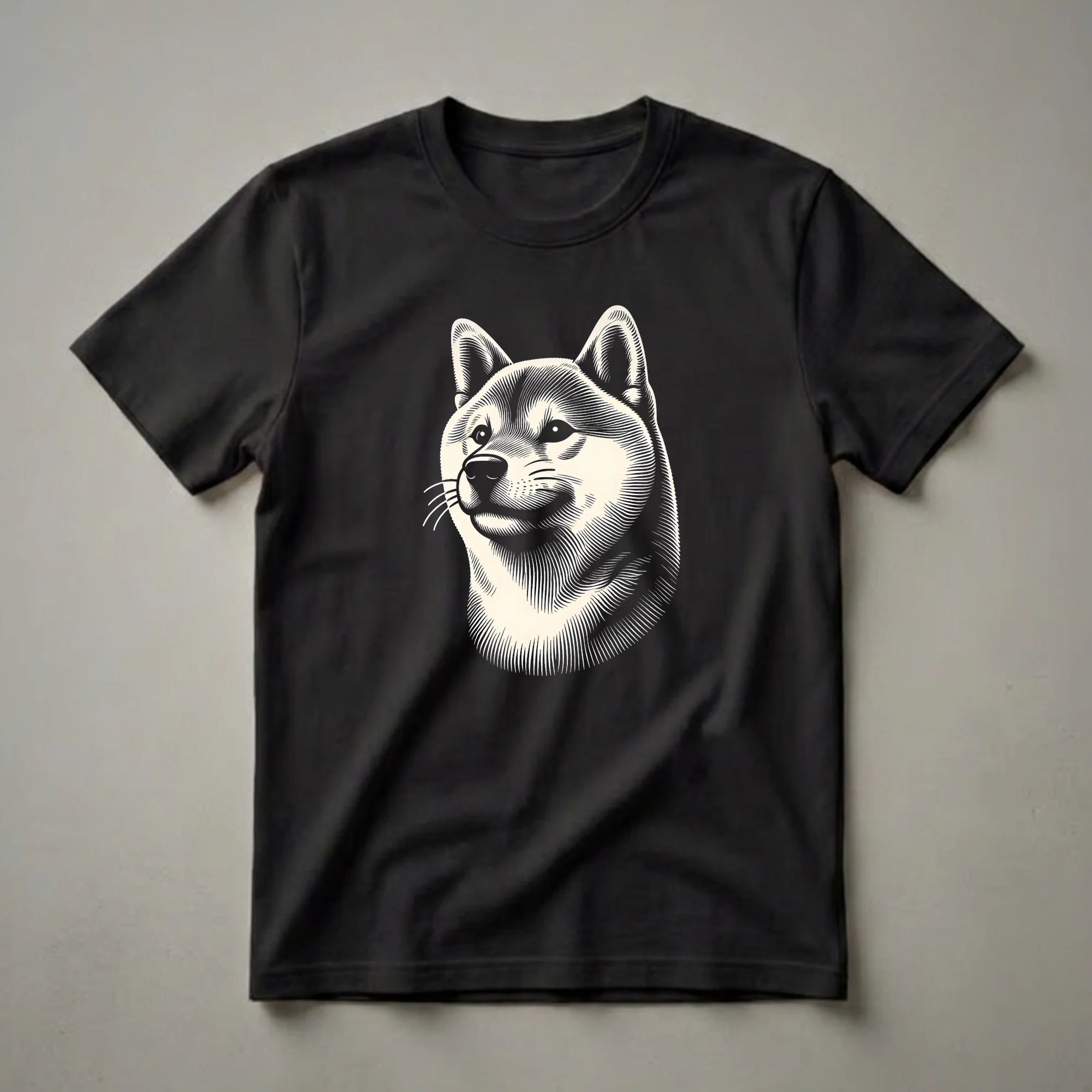 Shiba Inu enthusiasts who appreciate unique canine art will reach for this eye-catching graphic tee. The design features a detailed, black and white illustration of a Shiba Inu's face, rendered in a classic woodcut or engraving style. This artistic approach highlights the breed's distinctive features, from its alert, triangular ears and intelligent eyes to its characteristic foxy muzzle and alert expression. The intricate linework creates a sense of depth and texture, making the dog's face appear almost three-dimensional against the solid background. Shiba Inus, originating from Japan, are known for their spirited, bold, and independent nature, often described as cat-like in their cleanliness and aloofness. This shirt is a thoughtful gift for any woman or man who cherishes their Shiba Inu companion or admires the breed's unique charm. It's a staple in the collection for casual outings, dog park visits, or simply relaxing at home while celebrating your favorite furry friend. This t-shirt offers a stylish way to express your passion for this beloved Japanese dog breed.