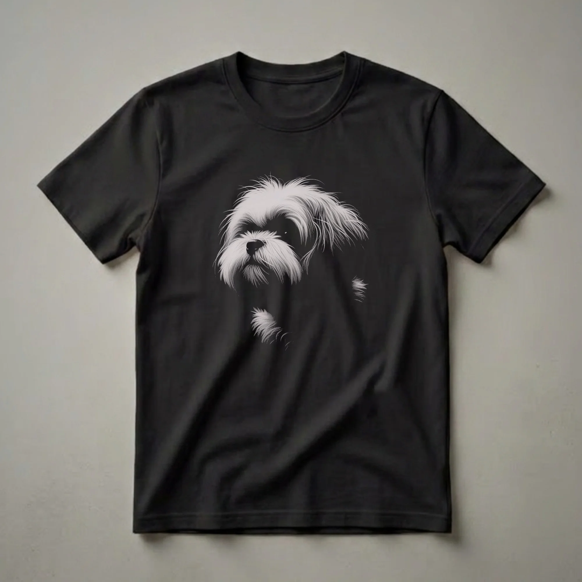 Shih Poo owners who appreciate the unique charm of their mixed-breed companions will reach for this artistic t-shirt. The design features a striking black and white drawing of a Shih Poo's face, rendered with fine detail that captures the breed's characteristic fluffy fur and expressive eyes. This graphic tee highlights the affectionate and playful nature of Shih Poos, known for their companionable disposition and adaptability to various living situations. Shih Poos, a cross between the Shih Tzu and the Poodle, often inherit the Poodle's intelligence and the Shih Tzu's outgoing personality, making them delightful pets. This shirt is a thoughtful gift for any Shih Poo mom or dad who cherishes their furry friend. Wear this unique t-shirt to casual outings, dog park visits, or simply while relaxing at home with your beloved pet. It's a subtle yet stylish way to express your devotion to this popular hybrid breed. This apparel is a true conversation starter.