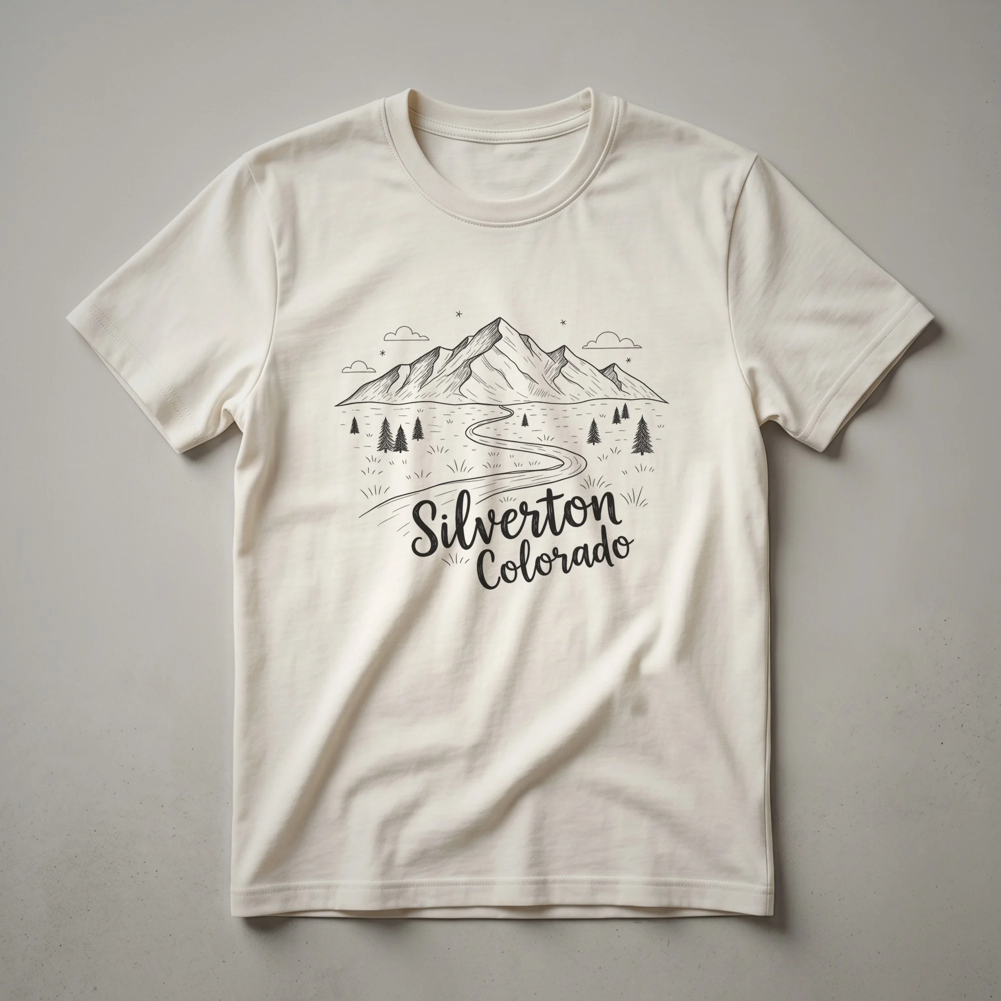 For those who feel the call of the high country, this graphic tee captures the spirit of Silverton, Colorado. The design features a striking sketch-style illustration of a majestic mountain range under a vast, starry night sky, complete with wispy clouds. A winding road meanders through the foreground, flanked by stylized pine trees and hints of grassy terrain, evoking the scenic beauty of the San Juan Mountains. The town's name, 'Silverton Colorado,' is elegantly scripted across the lower portion of the artwork, grounding the natural landscape with its location. Silverton, nestled high in the San Juan Mountains, is renowned for its rich mining history and its status as a gateway to incredible outdoor adventures, including skiing and hiking. This shirt is a thoughtful gift for anyone who has explored the rugged terrain around Silverton, or for those who dream of visiting this iconic Colorado destination. Wear this t-shirt on your next mountain excursion, to a casual gathering, or simply as a reminder of the breathtaking landscapes that define the Colorado Mountain West.
