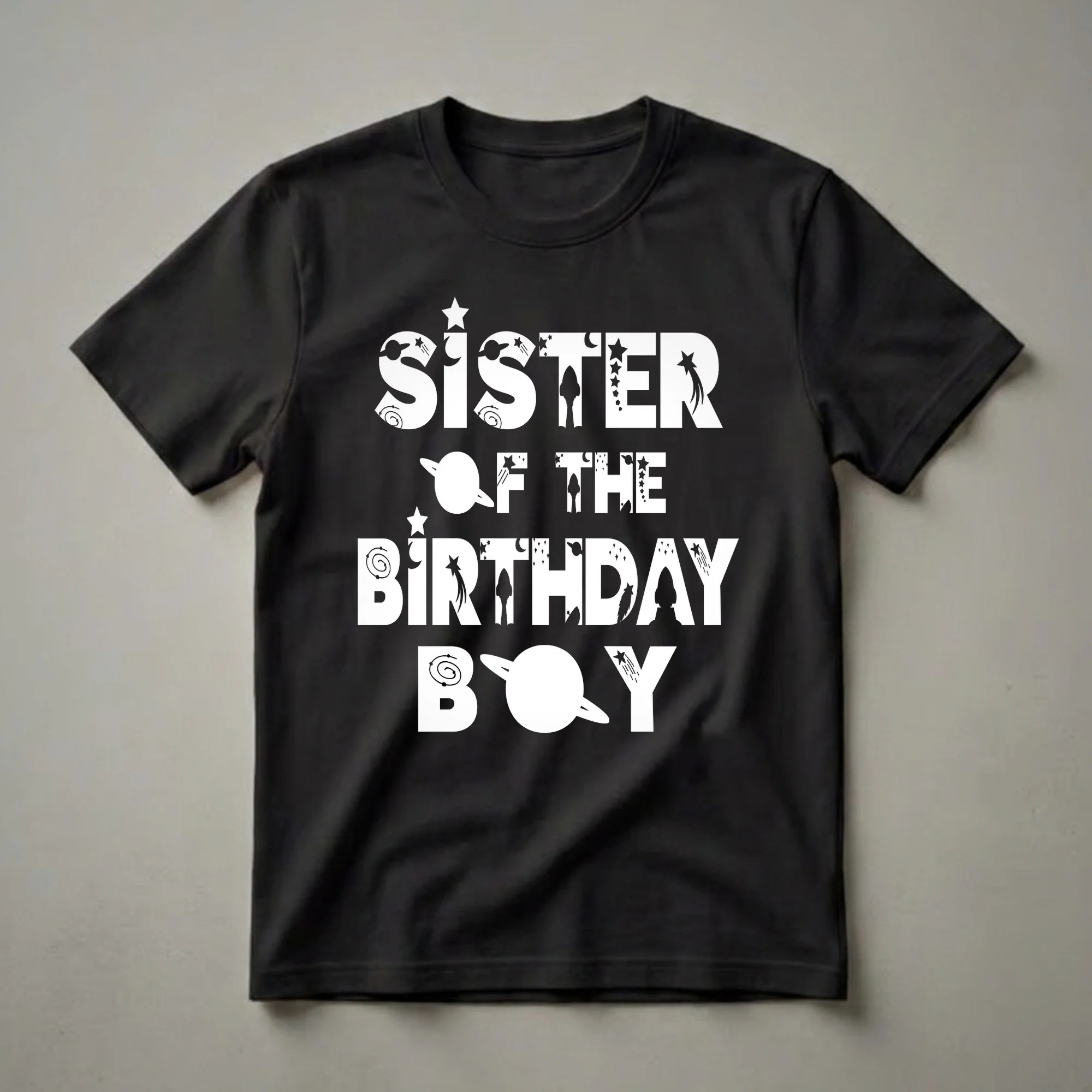 Sister of the birthday boy who is celebrating a space-themed birthday will love this unique t-shirt. The bold white lettering spells out 'SISTER OF THE BIRTHDAY BOY', with each letter creatively filled with celestial elements. You'll spot swirling galaxies, crescent moons, twinkling stars, shooting stars, planets with rings, and even a silhouette of a rocket ship. This eye-catching design is a natural fit for any young astronaut's sibling, adding an extra layer of fun to the birthday festivities. It's a thoughtful gift for a sister who wants to show her support for her brother's special day. Imagine her wearing this tee to the birthday party, a family gathering, or even just for a fun day out. This shirt is a fantastic way for her to feel included in the space adventure. It makes a wonderful present for birthdays, holidays, or just because. This graphic tee is a staple for any young girl who is part of a birthday celebration with a cosmic twist.