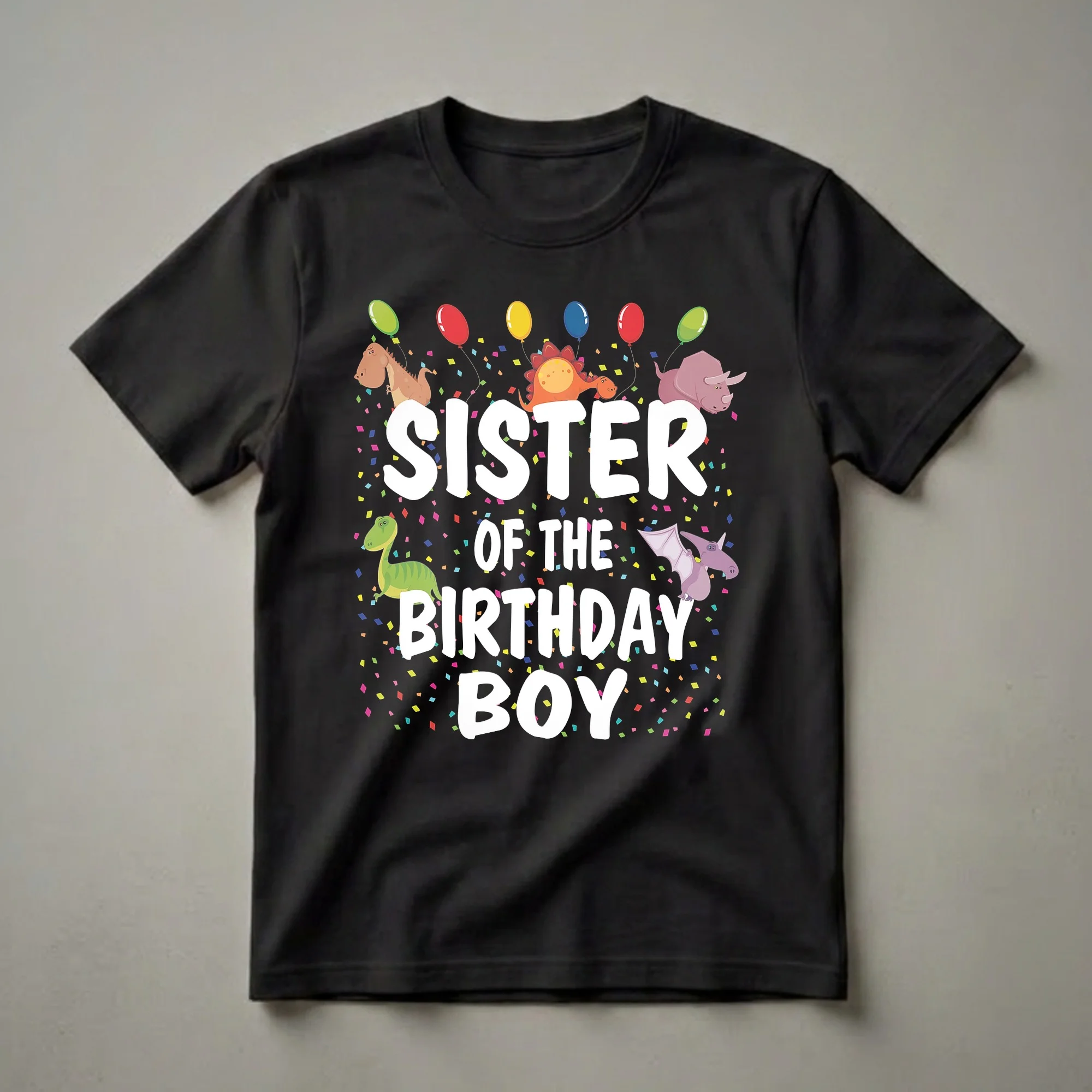 Sister of the Birthday Boy, this vibrant graphic tee is ready to roar at any dinosaur-themed birthday celebration. The design features bold white lettering that clearly states 'SISTER OF THE BIRTHDAY BOY,' surrounded by a playful assortment of cartoon dinosaurs, including a Tyrannosaurus Rex, a Stegosaurus, a Triceratops, and a Pterodactyl. Colorful balloons and confetti add to the festive atmosphere, making this shirt a standout piece for any young girl attending her brother's special day. Dinosaurs, which roamed the Earth during the Mesozoic Era, continue to capture the imagination of children worldwide, making this theme a perennial favorite for birthday parties. This t-shirt is a thoughtful gift for the sister who wants to show her support and join in the prehistoric fun. She will reach for this shirt to wear to the birthday party, family gatherings, or even just for a fun day out. It’s a great way for her to feel included and celebrate her brother's milestone. The playful design ensures she'll stand out and feel like part of the dino-mite celebration.