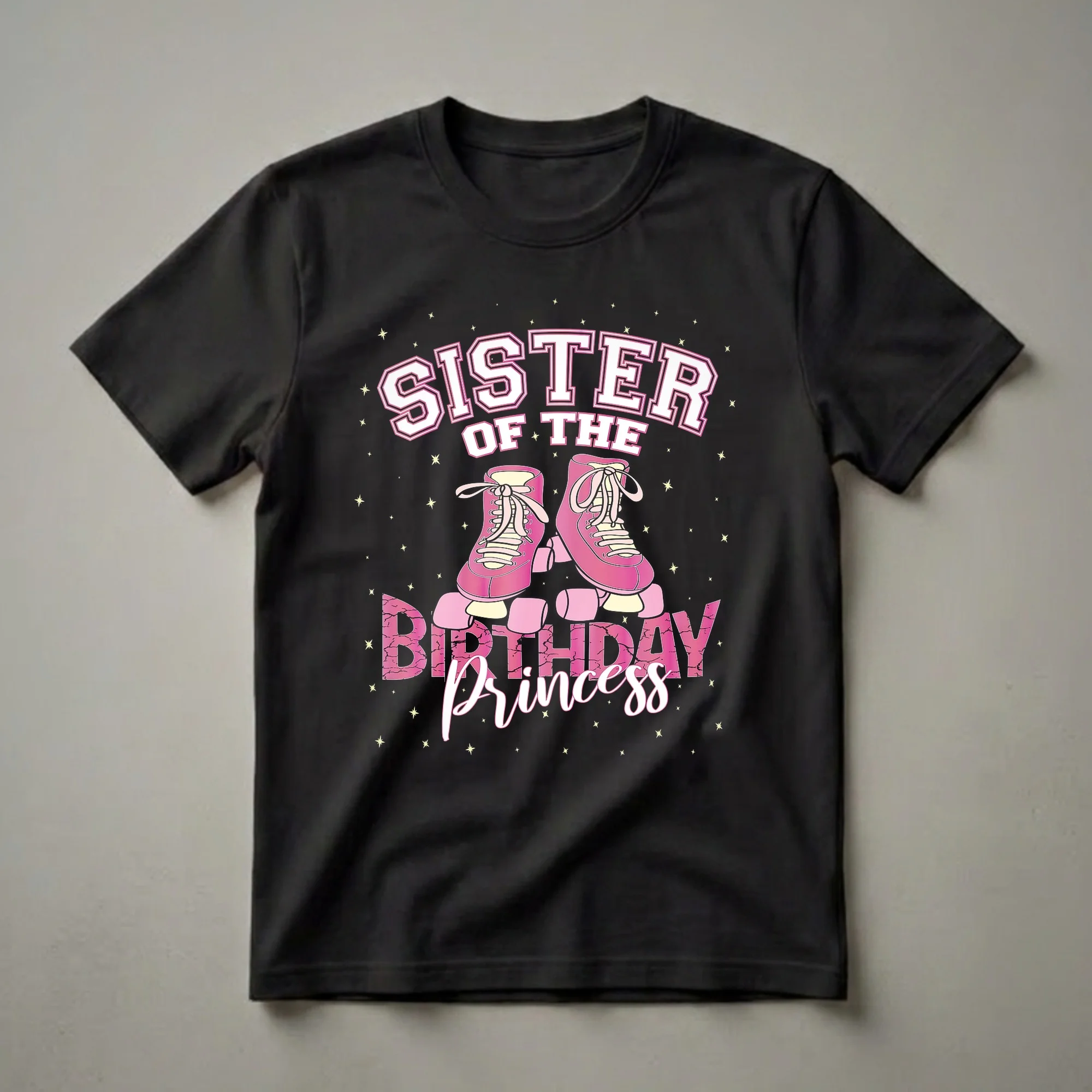 Celebrate your little one's big day in style with this fun roller skate-themed graphic tee, celebrating her role as the birthday princess's sister. This eye-catching graphic tee is made for the sister of the birthday girl, especially if her party theme involves roller skating. The design features a pair of vibrant pink roller skates with white laces, set against a black background sprinkled with yellow stars. Bold white and pink lettering announces 'SISTER OF THE BIRTHDAY PRINCESS' in a collegiate style, with 'Princess' written in a flowing script below. This shirt is a fantastic way for her to show her support and join in the birthday fun. Roller skating parties have been a popular choice for children's birthdays for decades, offering a fun and active way to celebrate. This t-shirt makes a thoughtful gift for any sister who loves to skate or wants to match her birthday princess sibling. She will reach for this tee for the party and for future skate outings. It's a staple in any birthday girl's sister's wardrobe, great to wear to the roller rink or for birthday photos.