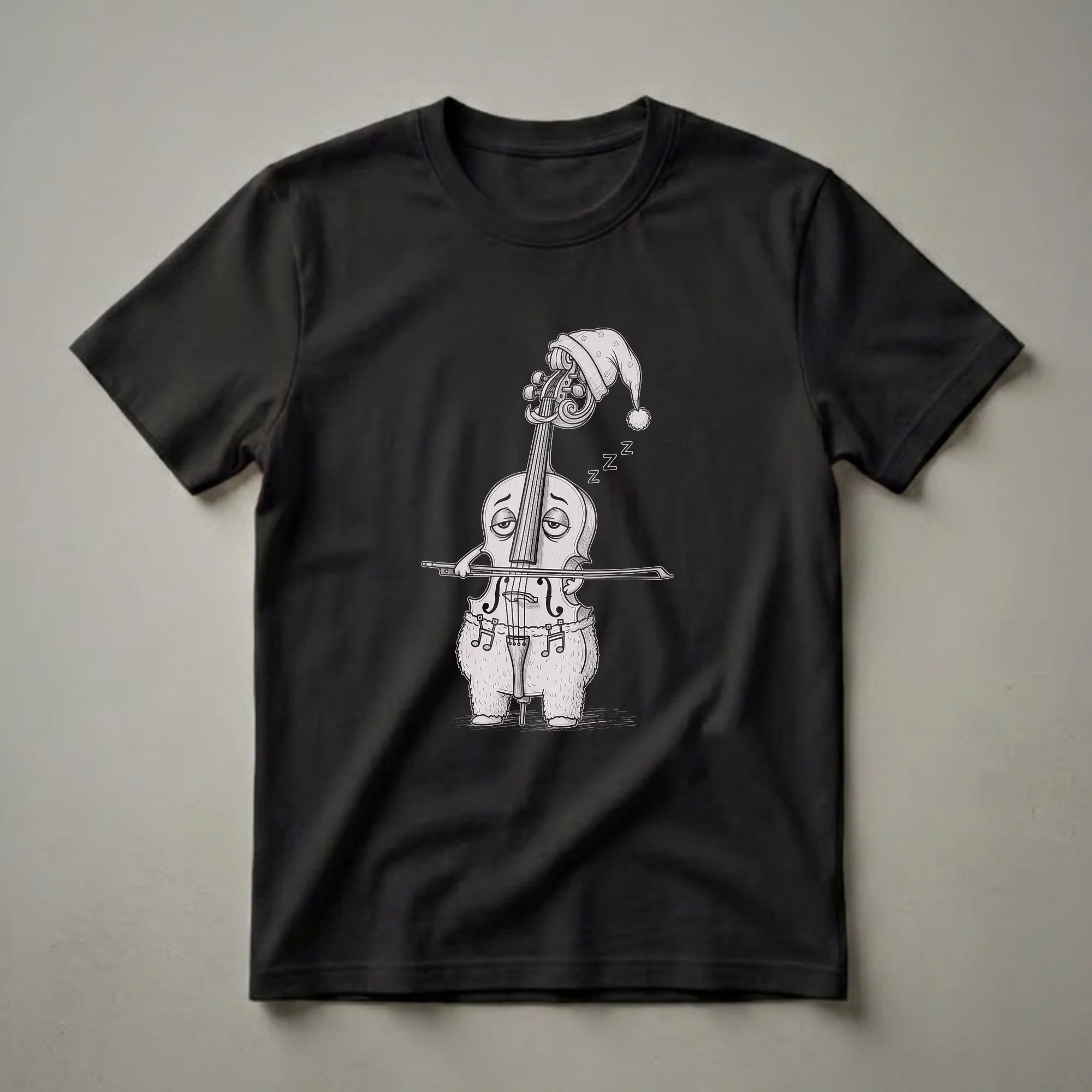 Cellists who appreciate a touch of humor will reach for this unique t-shirt. The graphic showcases a charmingly drawn cello, complete with a polka-dot pajama hat and fuzzy bottoms, looking quite sleepy with 'Zzz' symbols floating around it. This cello is depicted holding its bow, ready for a rest rather than a performance. The cello, a member of the string family, is known for its rich, deep tone and its role in both solo and orchestral music. Its distinctive f-holes and scroll are rendered in a playful, cartoonish style. This tee works well for music students, professional musicians, or anyone who finds joy in the world of classical music and wants to express their passion with a smile. It makes a thoughtful gift for the cellist in your life who might relate to needing a good night's sleep after practicing. Wear this eye-catching shirt to rehearsals, casual music gatherings, or simply while relaxing at home.