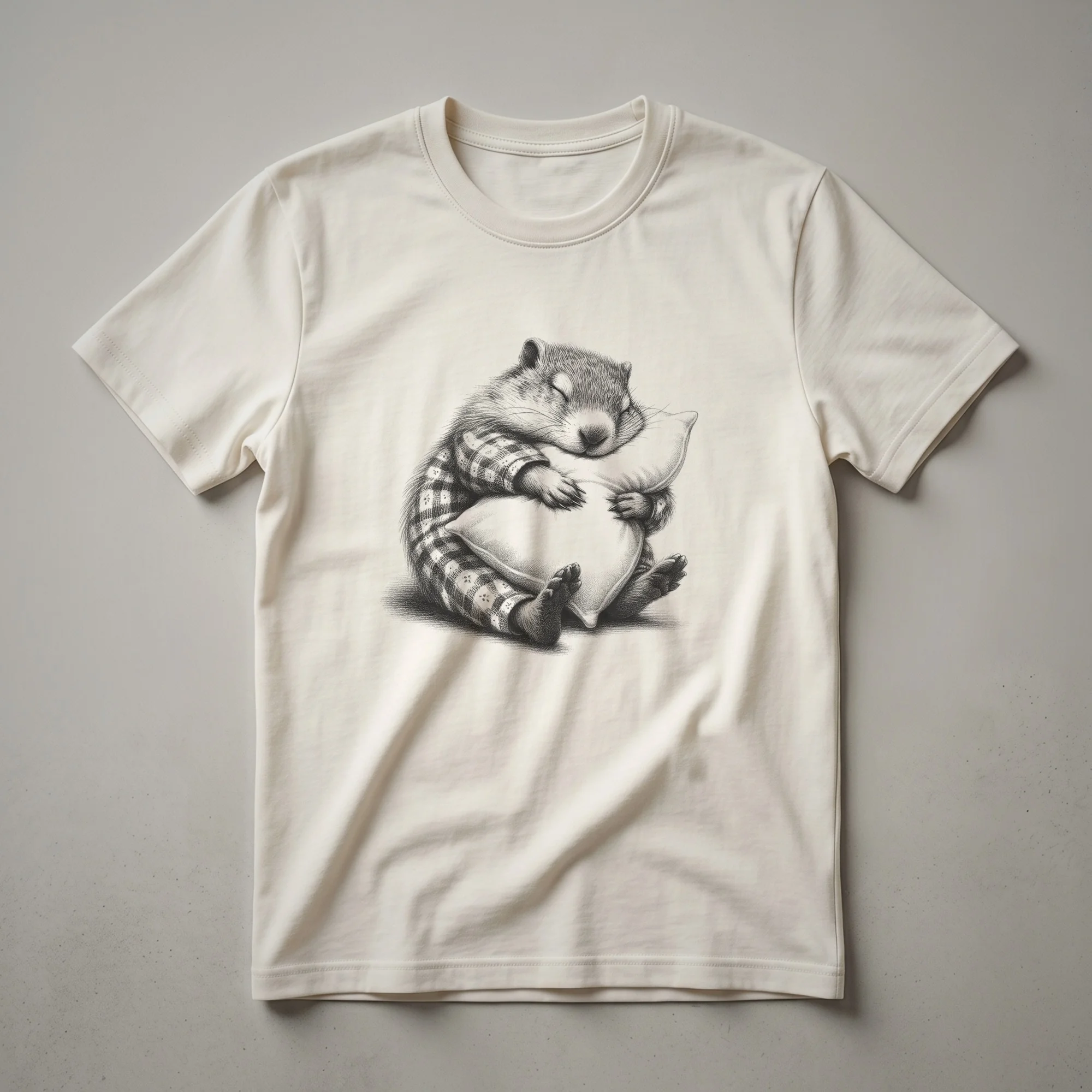 Groundhog owners who appreciate the quiet charm of these burrowing mammals will reach for this unique t-shirt. The design features a whimsical, vintage-style drawing of a groundhog nestled in its burrow, depicted wearing cozy pajamas and fast asleep. This artistic representation captures the gentle and often overlooked nature of these fascinating creatures. Groundhogs, also known as woodchucks, are native to North America and are famous for their hibernation habits, often emerging around Groundhog Day in early February to predict the coming of spring. This tee is a thoughtful gift for any wildlife enthusiast, nature lover, or someone who simply enjoys a good night's sleep. It's a comfortable and eye-catching piece of apparel that celebrates the serene side of the animal kingdom. Wear this shirt to your next nature walk, a casual brunch, or while relaxing at home, embracing the peaceful spirit of the sleeping groundhog. This graphic tee offers a unique way to express your appreciation for these shy, burrowing mammals.