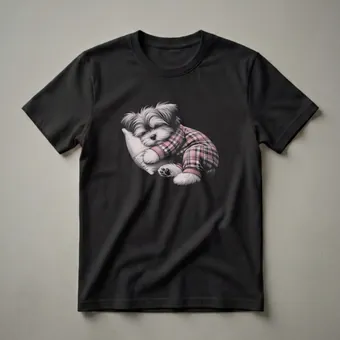 Morkie owners know the breed's affectionate nature and small stature, making them the ultimate lap dogs. This artistic t-shirt captures that cozy spirit with a detailed drawing of a Morkie dog sound asleep. The pup is depicted wearing adorable red and white plaid pajamas, complete with ribbed cuffs, and nestled comfortably on a plush pillow. The art style is reminiscent of a classic pencil sketch, highlighting the fine details of the dog's fluffy fur and the texture of the fabric. This graphic tee is a thoughtful gift for any Morkie mom or dad who cherishes their furry companion. It's a staple in the collection for anyone who loves to relax and unwind, much like the dog on the shirt. Imagine wearing this comfortable tee while enjoying a quiet evening at home, perhaps with your own Morkie curled up nearby. This shirt is a sweet reminder of the simple joys of pet ownership and the comfort of a good night's sleep. It's a unique piece of apparel that celebrates the bond between humans and their beloved canine friends, especially those with a penchant for adorable sleepwear.