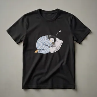 Penguin lovers who appreciate a good nap will adore this charming graphic tee. The artwork features a delightful drawing of a penguin curled up asleep on a fluffy white pillow, dressed in cozy blue and white striped pajamas. Three 'Zzz' symbols float above the sleeping bird, emphasizing its deep slumber. Penguins, known for their distinctive waddle and social colonies, are fascinating creatures that inhabit the Southern Hemisphere, from the icy landscapes of Antarctica to warmer coasts. This t-shirt captures a whimsical moment of rest, a relatable feeling for anyone who cherishes their sleep. It's a staple in the collection for those who understand the joy of a long nap or a lazy morning. This shirt works well for anyone who identifies with the penguin's dedication to rest. It makes a thoughtful gift for friends or family members who are always ready for a snooze, perhaps for a birthday or just because. Wear this tee to your next game night, a casual brunch, or simply while enjoying a relaxing day at home. It’s a comfortable and humorous way to express your love for both penguins and peaceful slumber.