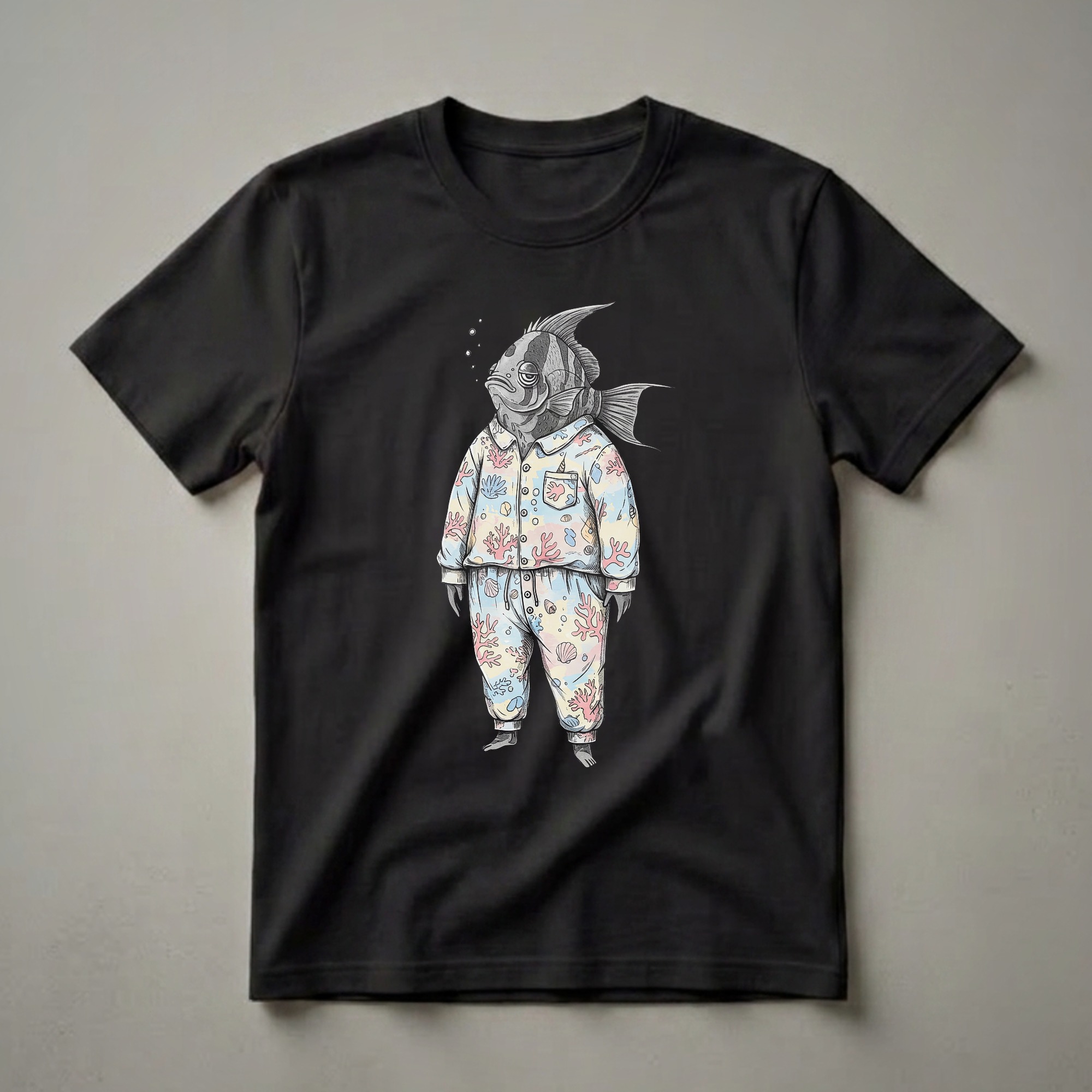 Anglers and ocean enthusiasts who appreciate a touch of humor will reach for this unique graphic tee. The design showcases a strikingly detailed angelfish, rendered in grayscale, sporting a whimsical pajama set. The pajamas themselves are adorned with a playful pattern of pink coral branches, scattered seashells, and abstract blue and yellow shapes, evoking a serene underwater scene. Bubbles rise from the fish's head, emphasizing its sleepy, perhaps even slightly grumpy, expression. This t-shirt is a thoughtful gift for anyone who loves fishing, marine life, or simply enjoys a quirky and eye-catching design. It's well suited for lounging around the house, especially on lazy weekend mornings before heading out for a day on the water. The angelfish, known for its vibrant colors in its natural habitat, is humorously depicted here in a state of repose, making it a relatable image for anyone who has ever felt the urge to stay in bed. This shirt offers a fun way to express a love for the aquatic world and a relaxed attitude towards life. It’s a conversation starter that combines artistic flair with a humorous take on marine creatures.