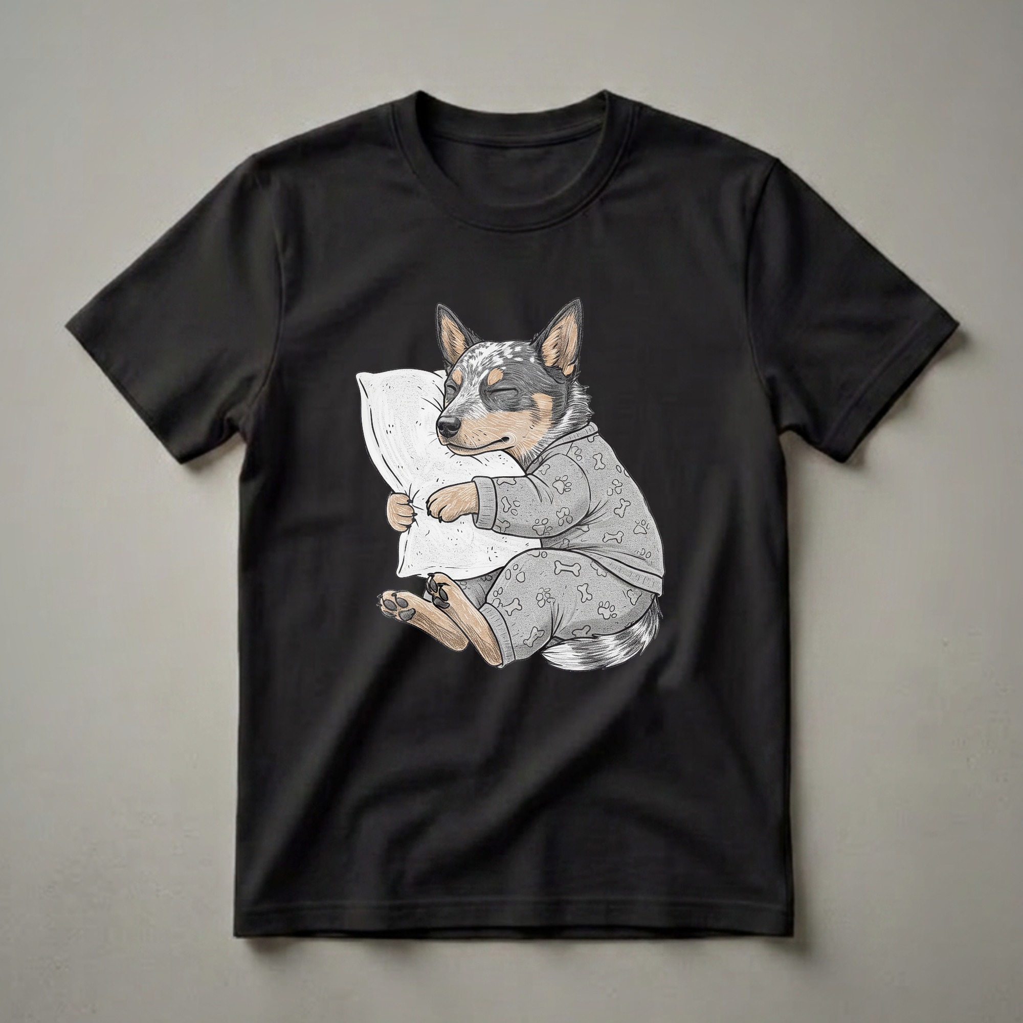 Australian Cattle Dog owners know their intelligent and energetic companions deserve a good night's sleep. This eye-catching graphic tee captures that sentiment with a charming illustration of an ACD dressed in cozy pajamas, complete with paw and bone patterns, sound asleep while clutching a pillow. The detailed artwork showcases the breed's distinctive coat markings and alert ears, even in slumber. Australian Cattle Dogs, also known as Blue Heelers or Red Heelers, are renowned for their herding abilities and boundless energy, making this depiction of one finally resting a relatable and humorous image for any fan of the breed. This comfortable t-shirt is a go-to tee for anyone who appreciates a good nap, whether they're a dog mom, dog dad, or simply a lover of all things canine. It makes a thoughtful gift for the Australian Cattle Dog enthusiast in your life who enjoys a cozy night in or a lazy weekend morning. Wear this shirt to relax at home, during your next pajama party, or to show off your love for your furry friend.