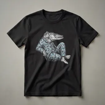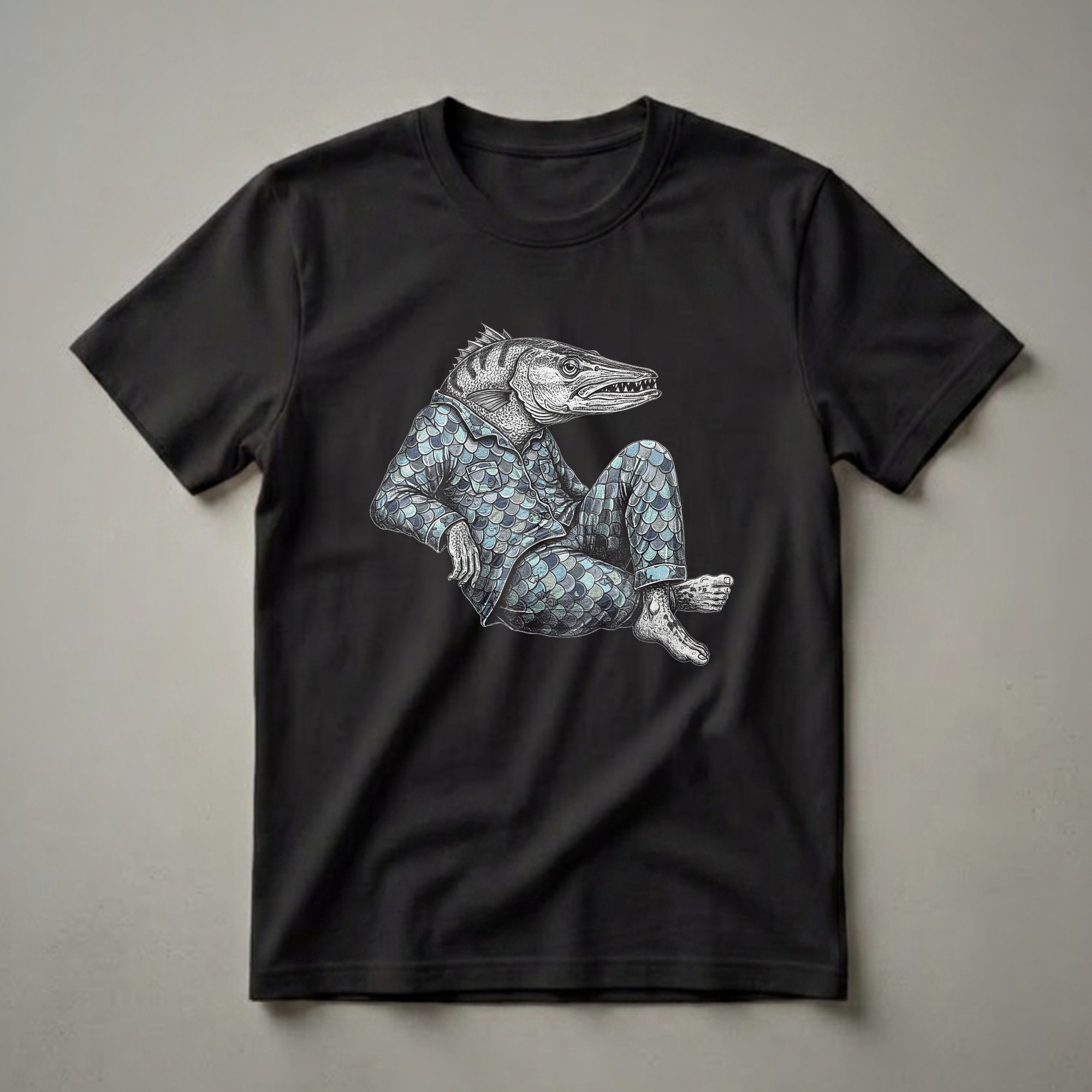 Anglers who appreciate a good laugh will reach for this unique barracuda fish t-shirt. The striking graphic depicts a barracuda, known for its formidable appearance and sharp teeth, depicted in a surprisingly relaxed pose. This particular barracuda is shown wearing a detailed set of pajamas adorned with a scale-like pattern, complete with a collar and buttons, and is seated cross-legged. The artwork is rendered in a detailed, almost vintage illustration style, with fine lines and shading that bring the creature to life against a stark black background. Barracudas are predatory fish found in tropical and subtropical oceans worldwide, often recognized for their elongated bodies and aggressive hunting tactics. This tee offers a humorous contrast to their fierce reputation, presenting one in a moment of repose. It's a thoughtful gift for any fisherman or woman who understands the quiet moments of waiting by the water, or for someone who simply enjoys quirky, conversation-starting apparel. This shirt works well for casual outings, fishing trips, or lounging at home after a long day on the water. The detailed illustration makes this a standout piece for any collection.