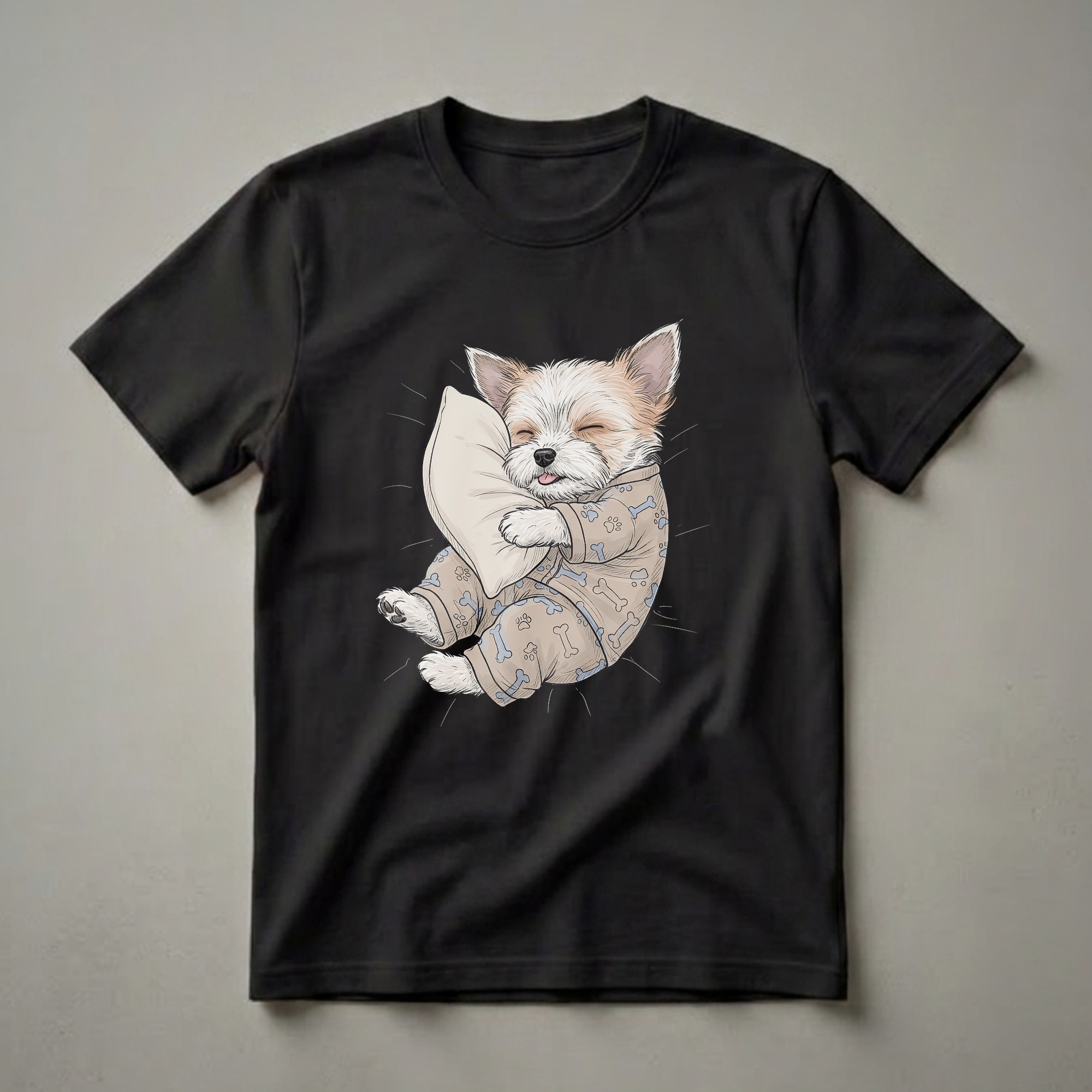 Biewer Terriers, known for their playful yet gentle nature, are captured in a moment of peaceful slumber on this charming graphic tee. This adorable illustration showcases a Biewer Terrier puppy, complete with its distinctive tri-color coat, nestled comfortably on a soft pillow. The puppy is depicted wearing cozy pajamas adorned with a fun pattern of blue bones and paw prints, highlighting its sleepy disposition with a tiny tongue peeking out. Biewer Terriers, a relatively new breed developed from the Yorkshire Terrier, are cherished for their affectionate personalities and striking appearance. This shirt is a thoughtful gift for any dog mom or dad who adores their canine companion, especially those who appreciate the breed's unique charm. It's a go-to tee for relaxing at home, enjoying a lazy weekend morning, or gifting to a fellow dog enthusiast. Imagine wearing this t-shirt while enjoying your morning coffee or unwinding after a long day, a constant reminder of the joy your pet brings. This apparel is a delightful way to express your love for dogs and celebrate the simple pleasure of a good night's sleep, just like this sweet pup.