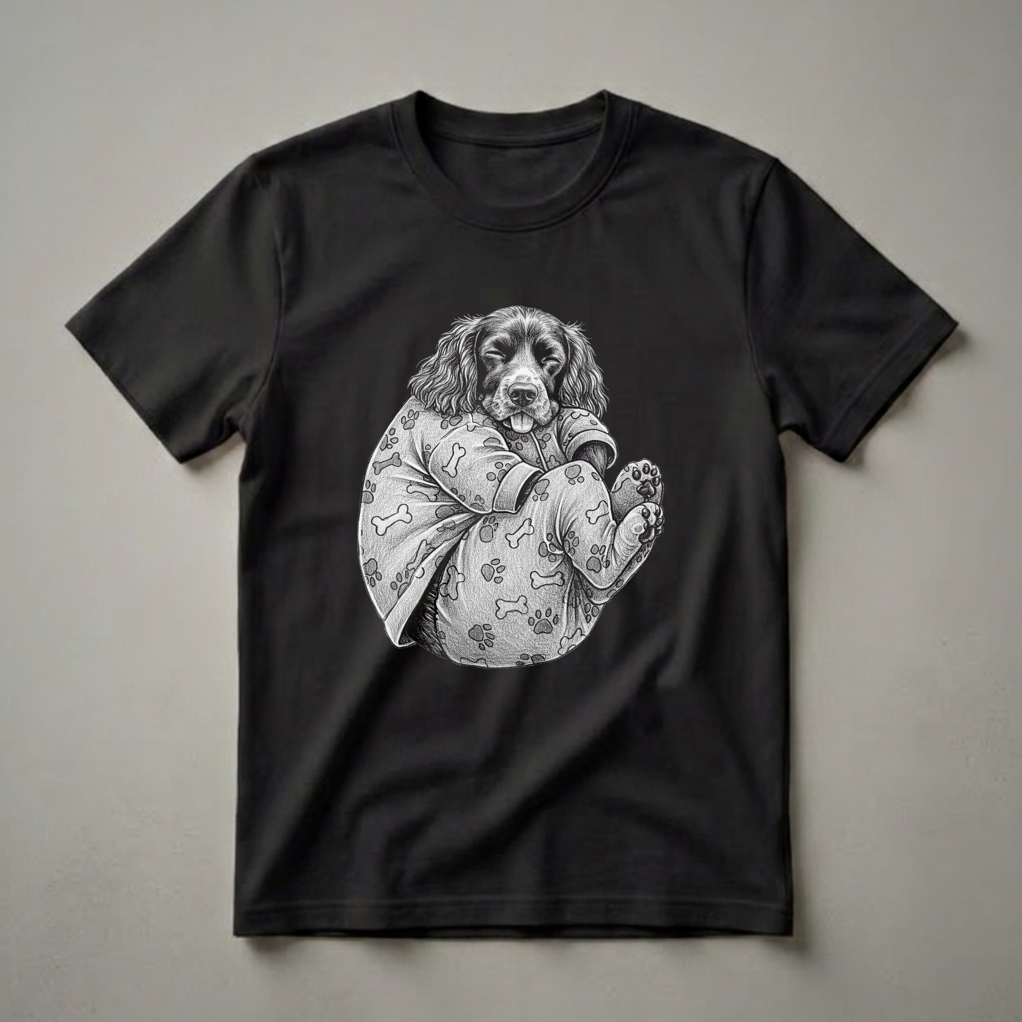 Boykin Spaniel owners know the breed's affectionate nature and love for comfort, making this sleepy dog graphic tee a perfect addition to any wardrobe. The detailed pencil sketch captures a Boykin Spaniel dog curled up and fast asleep, dressed in cozy pajamas adorned with a pattern of paw prints and bones. This artistic rendering showcases the breed's characteristic wavy ears and gentle expression, all while highlighting the playful pajama design. Boykin Spaniels, originally bred in South Carolina for flushing waterfowl, are known for their intelligence and eagerness to please, traits that shine through even in their slumber. This t-shirt is a thoughtful gift for any Boykin Spaniel mom or dad who appreciates a touch of humor and canine charm. It's a go-to tee for relaxing at home, enjoying a lazy weekend morning, or attending casual gatherings with fellow dog enthusiasts. The unique artwork makes this shirt a conversation starter and a delightful way to express your love for your furry companion. Whether you're buying for yourself or as a present, this comfortable shirt celebrates the joy of dog ownership.