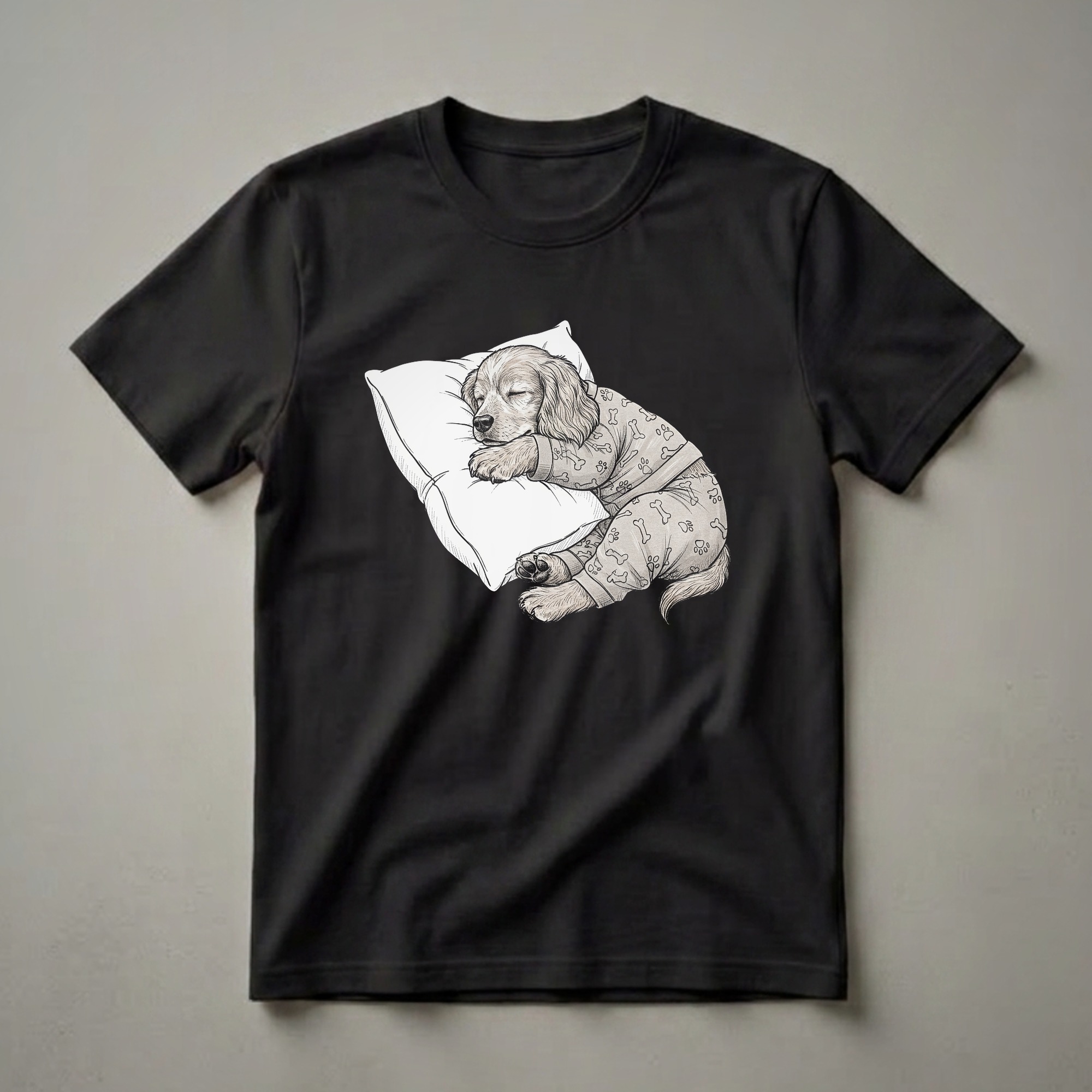 English Cocker Spaniel owners know the breed's gentle nature and love for comfort, making this pajama-clad puppy graphic tee a perfect representation of their furry friend. The detailed sketch-style illustration showcases a young spaniel, complete with floppy ears and a contented expression, fast asleep on a plush pillow. The puppy is dressed in adorable pajamas adorned with a pattern of bones and paw prints, highlighting the playful yet cozy theme. This t-shirt is a thoughtful gift for any woman or man who cherishes their English Cocker Spaniel, or for kids who adore dogs. It's a comfortable and charming piece of apparel that celebrates the quiet moments of canine companionship. Imagine wearing this tee while relaxing at home, enjoying a lazy weekend morning, or even to a casual get-together with fellow dog enthusiasts. The design captures the essence of a peaceful slumber, making it a go-to tee for anyone who appreciates the simple joys of life with their dog. This shirt is a delightful way to express your love for the breed and its endearing personality, offering a touch of whimsy and warmth.