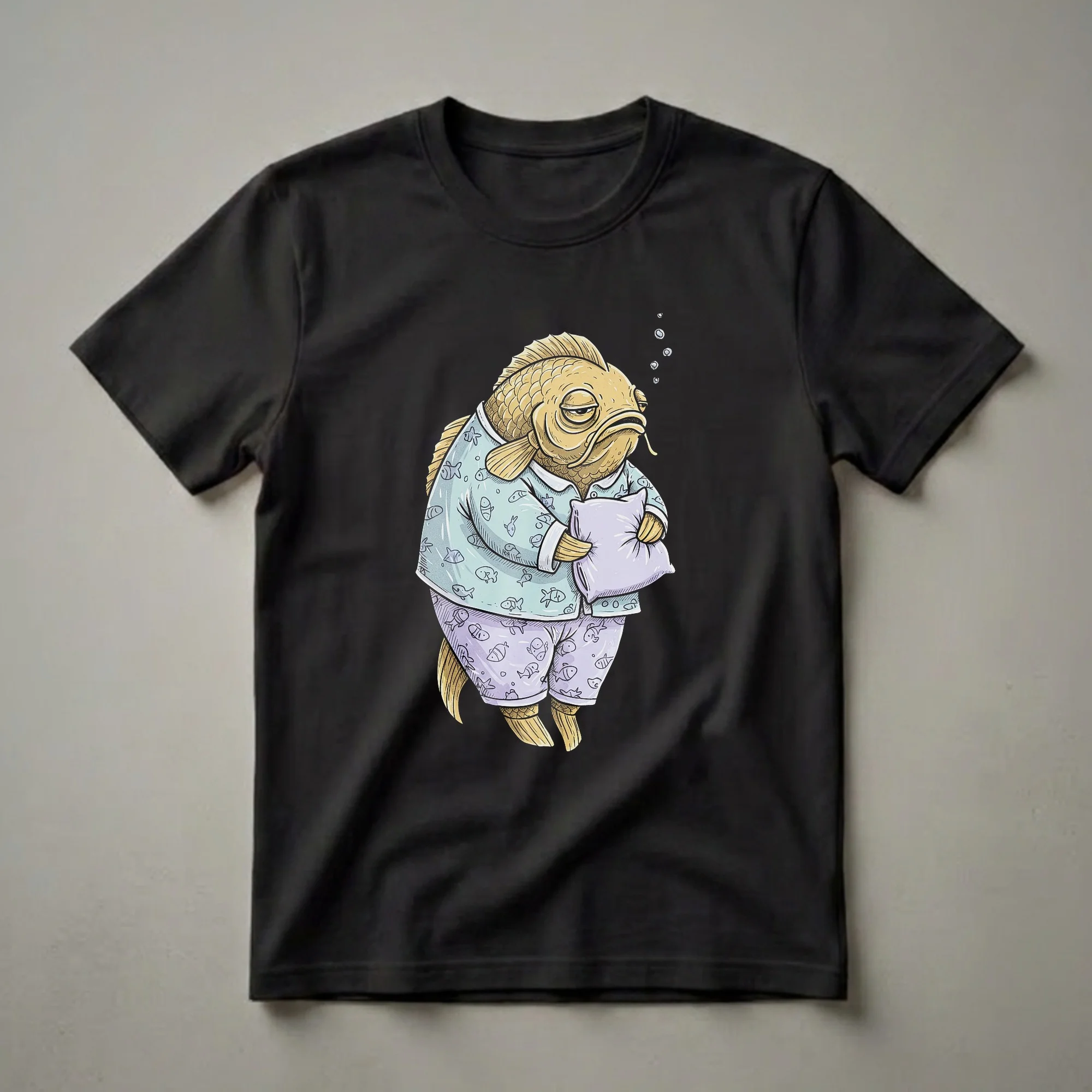 Anglers who appreciate a good laugh will reach for this humorous fish t-shirt. The graphic showcases a cartoon fish, depicted with a weary expression, dressed in light blue pajamas adorned with small fish patterns and purple pajama bottoms also featuring fish motifs. It clutches a soft purple pillow, with a few bubbles rising from its mouth, suggesting it's just woken up or is about to drift off. This eye-catching design captures the relatable feeling of being tired, even for aquatic creatures. Fish, like the common carp often depicted in such humorous art, are known to have periods of reduced activity, especially in colder water temperatures, mirroring a desire for rest. This tee works well for anyone who loves fishing, whether they are casting lines at dawn or dreaming of the next big catch. It makes a thoughtful gift for the fisherman in your life who appreciates a touch of humor with their passion. Wear this comfortable shirt to your next fishing trip, a casual outing, or simply while relaxing at home, embracing the laid-back vibe.