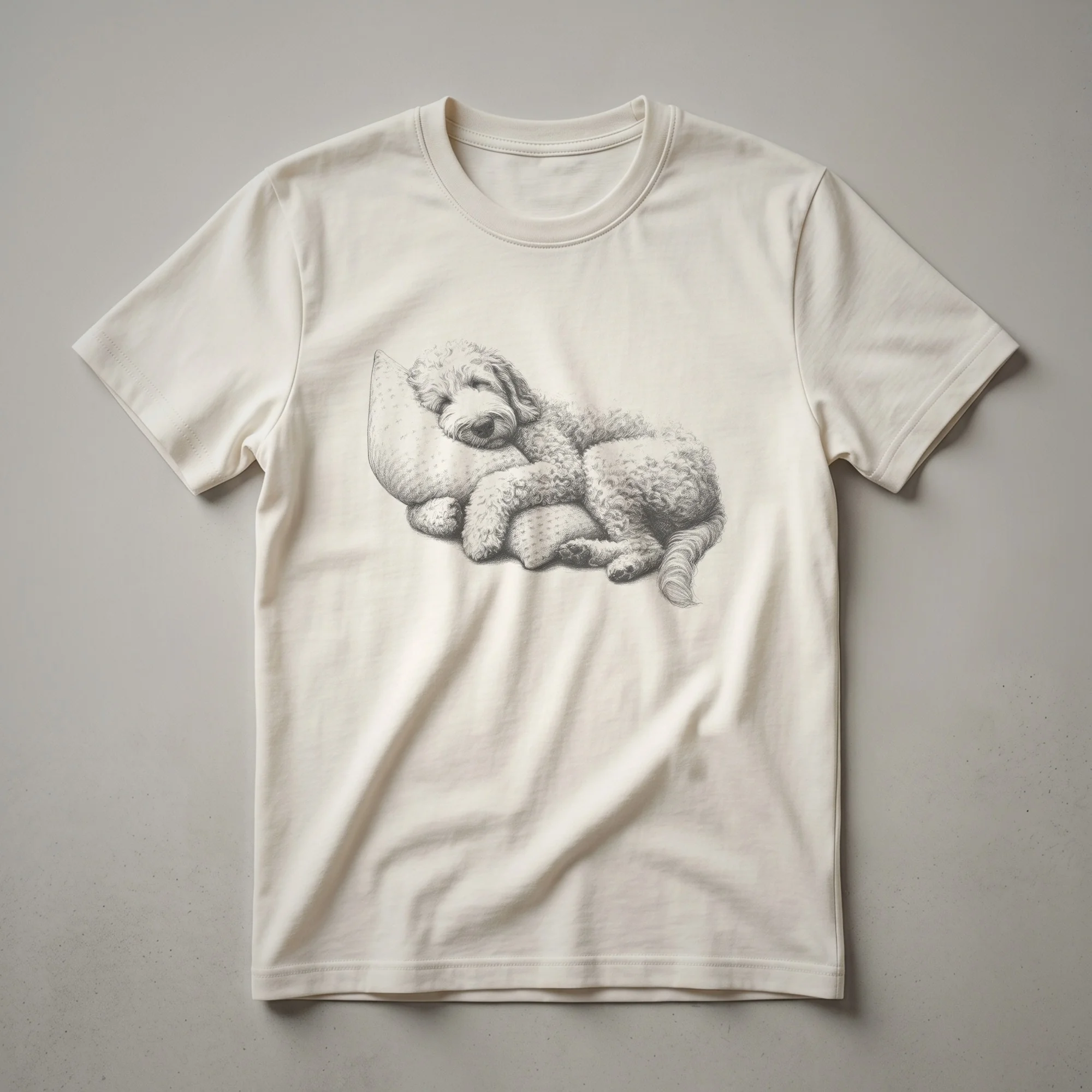 Goldendoodle owners who appreciate a touch of whimsy will adore this unique graphic tee. The design features a charming, hand-drawn illustration of a Goldendoodle dog comfortably lounging, dressed in cozy pajamas. This artistic rendering captures the breed's friendly and gentle nature, presenting it in a relaxed, sleepy pose that many dog parents can relate to. Goldendoodles, known for their intelligence and affectionate temperament, are a popular choice for families and individuals seeking a loyal companion. This shirt is more than just apparel; it's a statement piece for those who consider their furry friend a cherished member of the family. It makes a thoughtful gift for any Goldendoodle mom or dad, especially for birthdays or holidays. Imagine wearing this comfortable t-shirt while enjoying a lazy weekend morning or a casual outing with fellow dog enthusiasts. It’s a go-to tee for anyone who loves to express their passion for their canine companions through their wardrobe, offering a blend of comfort and distinctive style that celebrates the joy of dog ownership.