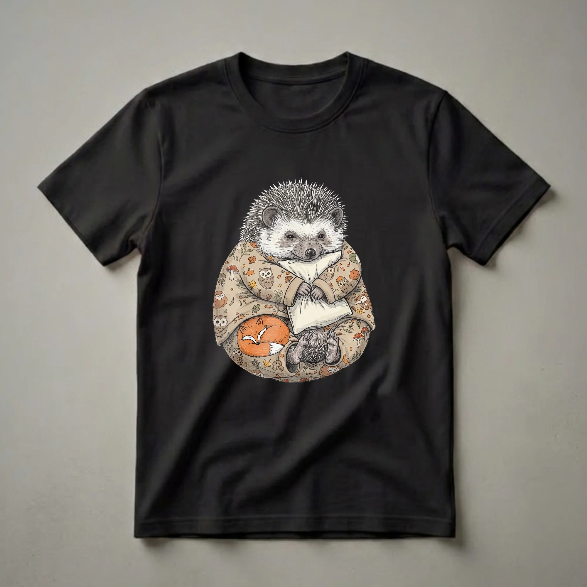 Hedgehogs, known for their nocturnal habits and tendency to hibernate, are the perfect symbol of a good night's sleep. This eye-catching graphic tee features a whimsical illustration of a hedgehog nestled in pajamas, complete with a woodland-themed pattern of owls, mushrooms, and falling leaves. Curled up beside the hedgehog is a sleeping fox, adding to the cozy, autumnal scene. The art style is reminiscent of watercolor, giving it a soft, artistic feel. This t-shirt is a thoughtful gift for women who adore hedgehogs and appreciate unique, nature-inspired designs. It's a staple in the collection for anyone who loves to relax and unwind. Imagine wearing this comfortable tee on a chilly evening, perhaps while reading a book or enjoying a warm drink. It's also a fun conversation starter at casual gatherings or pajama parties. The detailed artwork captures the gentle nature of these small creatures, making it a beloved piece for any animal enthusiast. This shirt is a go-to tee for those who find joy in the quiet moments of life and the charm of forest animals.