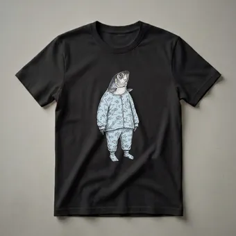 Anglers and fish enthusiasts will appreciate this unique graphic tee featuring a sleepy herring fish dressed in light blue pajamas. The all-over print on the pajama set includes various fish, waves, and bubbles, creating a whimsical underwater scene. The herring, a small, oily fish, is a common catch and a staple in many diets, often found in large schools in coastal waters. This t-shirt captures a humorous, relaxed moment, imagining the fish itself ready for a good night's sleep. It's a playful design that stands out from typical fishing apparel. This shirt works well for anyone who enjoys fishing, marine life, or simply appreciates a good pun. It makes a thoughtful gift for the fisherman in your life who enjoys a good laugh and a comfortable tee. Wear it to your next fishing trip, a casual outing, or simply while relaxing at home. This comfortable shirt is a great addition to any angler's wardrobe.