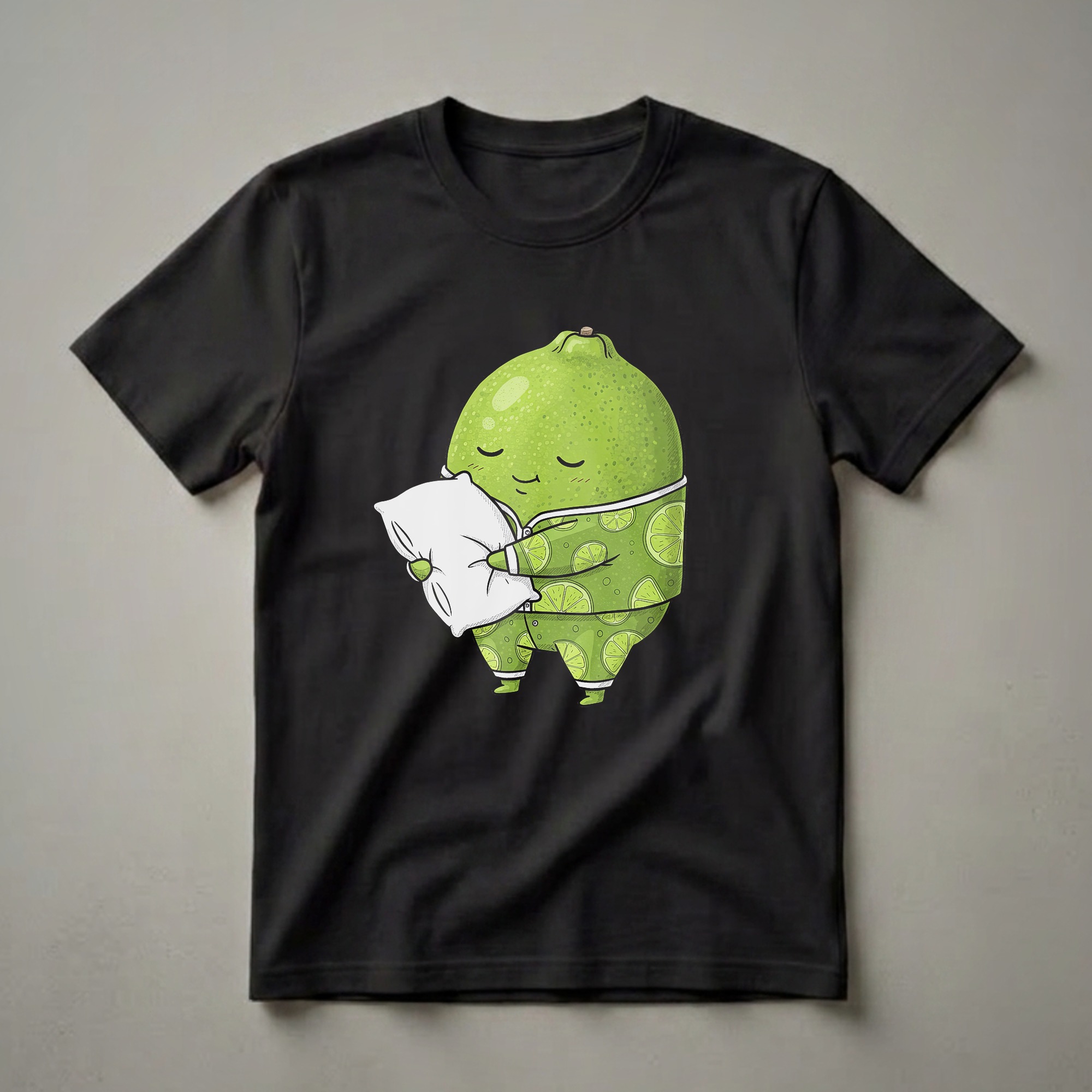 Citrus lovers who appreciate a good laugh will reach for this eye-catching graphic tee. The design features a whimsical, anthropomorphic lime character dressed in festive pajamas adorned with smaller lime slices. This sleepy lime is depicted in a relaxed pose, embracing a fluffy white pillow, with its eyes gently closed and a contented smile. The art style employs a watercolor texture, giving the character a soft, appealing look. Limes, known for their tart flavor and vibrant green hue, are a staple in kitchens worldwide, often used in beverages, desserts, and savory dishes. This t-shirt captures the universal desire for rest and relaxation, personified by a beloved citrus fruit. It makes a thoughtful gift for anyone who enjoys a cozy night in or a humorous take on food-related themes. This tee works well for casual wear, lounging at home, or as a fun conversation starter at a relaxed gathering. The playful design is sure to bring a smile to anyone who sees it, especially those who have a fondness for fruits and a good sense of humor.