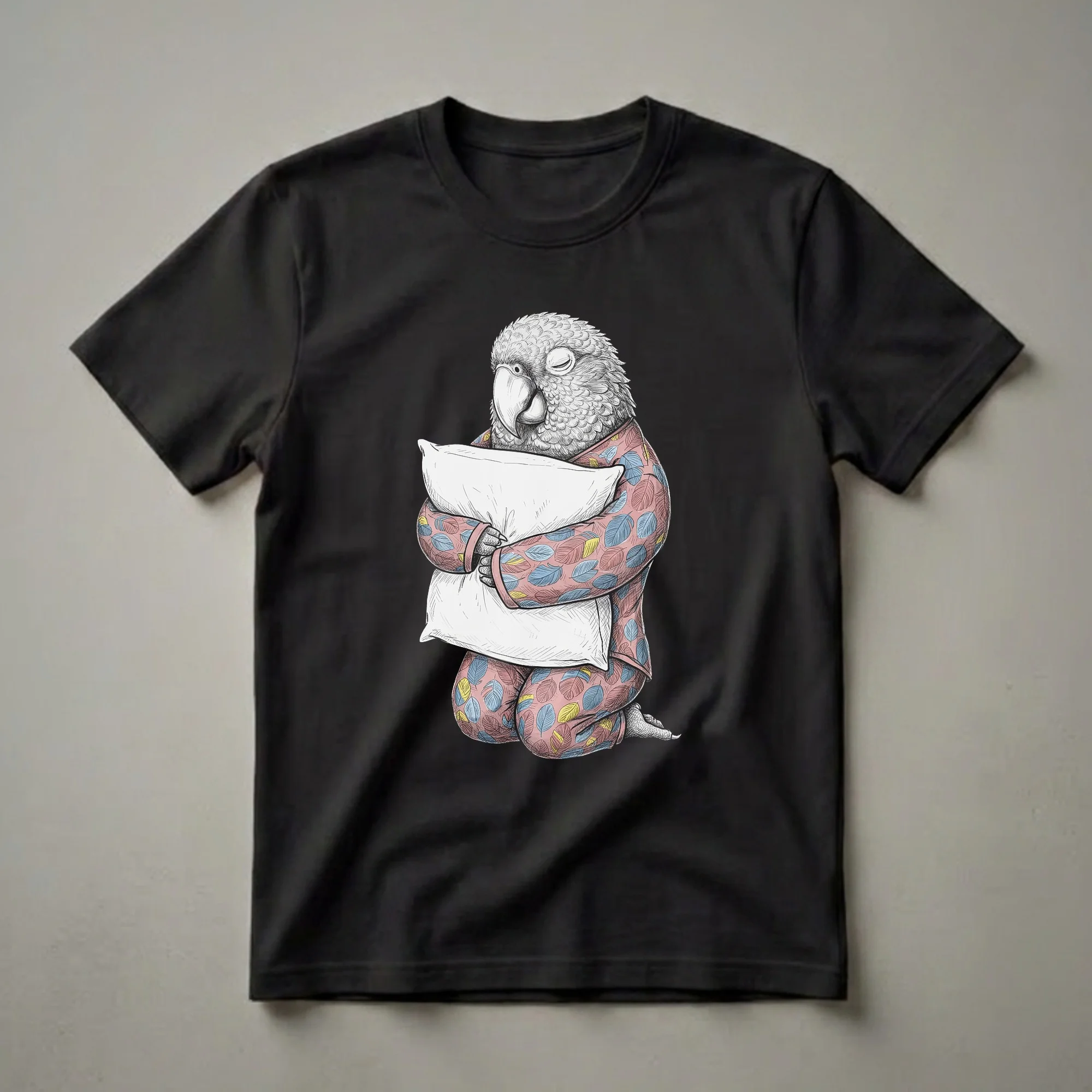 Macaw owners know the unique personalities and affectionate nature of these intelligent birds. For those who adore these vibrant creatures, this graphic t-shirt brings a touch of humor and comfort. The illustration depicts a detailed sketch of a macaw, complete with its signature large beak and feathered head, all dressed in charming pink pajamas adorned with a playful leaf pattern. With its eyes closed and clutching two fluffy pillows, the bird embodies a sense of deep slumber and relaxation. Parrots, including macaws, can sleep for varying amounts of time, often tucking their heads into their wings or feathers when resting securely. This unique tee is a wearable piece of art that celebrates the love for pet birds. It makes a thoughtful gift for any parrot mom, dad, or anyone who cherishes the companionship of these magnificent avian friends. Imagine wearing this cozy shirt to your next bird-watching gathering or simply lounging at home.