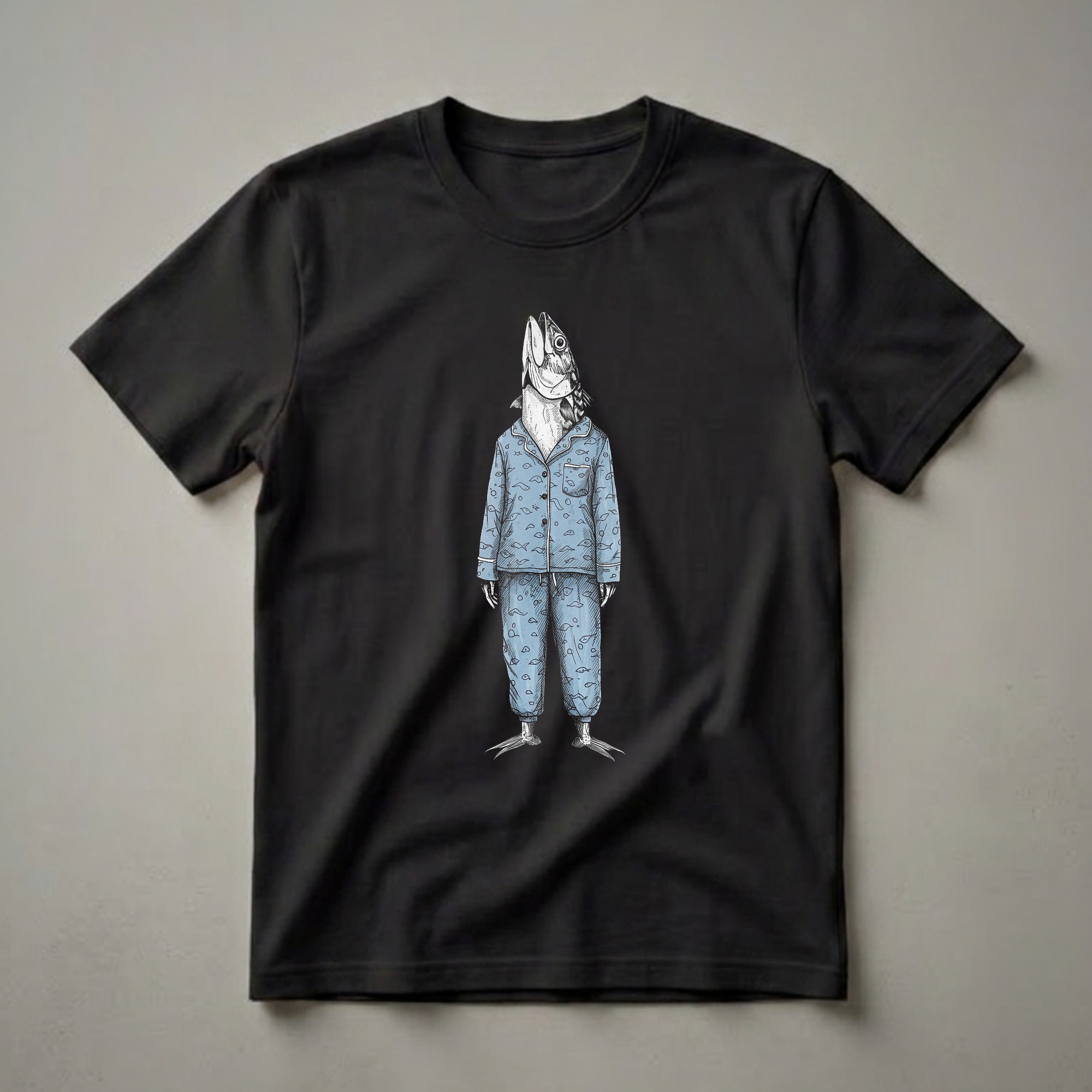 Fishermen and women who love a good sleep and a laugh will adore this uniquely illustrated graphic tee featuring a pajama-clad mackerel. The design showcases a hand-drawn illustration of a mackerel fish, a common species found in temperate waters worldwide, depicted wearing a set of light blue pajamas. The pajamas are adorned with a subtle pattern of smaller fish and bubbles, adding to the whimsical nature of the artwork. The mackerel's head is tilted back, mouth agape, giving it a distinctly sleepy or perhaps even surprised expression. This shirt is a thoughtful gift for the fisherman or woman in your life who enjoys a bit of humor with their passion. Mackerel are known for their schooling behavior and are a popular catch for recreational anglers. This unique t-shirt is a go-to for casual wear, lounging at home, or even as a conversation starter at your next fishing trip. It's a fun way to express your love for the sport and a good sense of humor. The detailed sketch style of the artwork gives it a vintage yet playful feel, making it a standout piece in any casual wardrobe. Whether you're casting a line or just relaxing, this tee brings a smile.