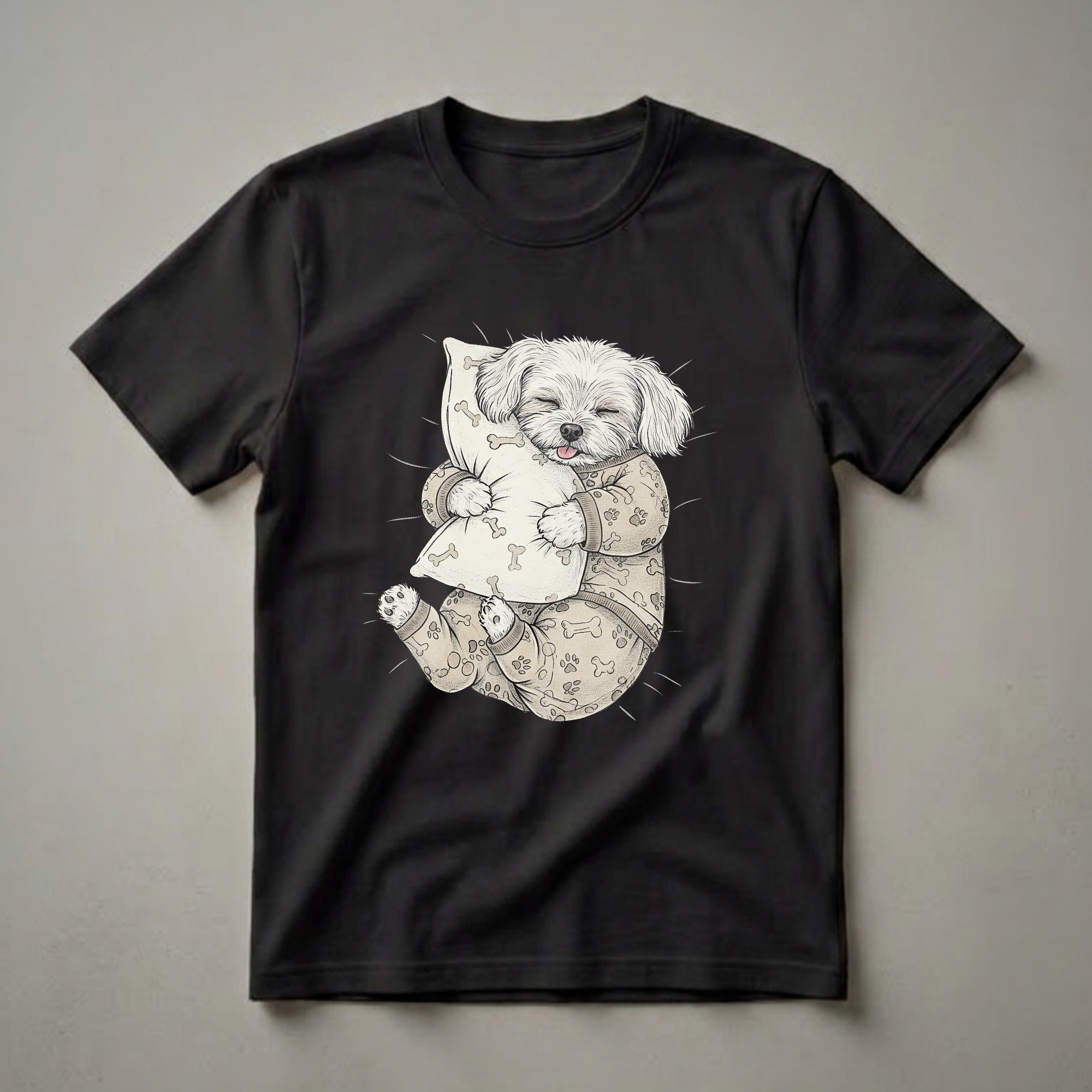Maltese dog owners know the joy of their fluffy companions, and this graphic tee captures that sleepy charm. The illustration showcases a white Maltese dog, dressed in cozy pajamas adorned with a playful pattern of bones and paw prints, nestled in a deep slumber. It's hugging a matching bone-patterned pillow, with its eyes closed and a tiny pink tongue peeking out, embodying pure contentment. This shirt is a thoughtful gift for any Maltese mom or dad who cherishes their furry friend's relaxed moments. Maltese dogs, originating from the Mediterranean island of Malta, are known for their gentle temperament and affectionate nature, making them beloved pets worldwide. This tee works well for lounging at home, casual outings, or as a unique pajama top for a cozy night's sleep. It's a staple in the collection for anyone who loves to express their devotion to their canine companions through comfortable and stylish apparel. Imagine wearing this to a relaxed weekend brunch or while enjoying a quiet evening with your own sleepy pup. This t-shirt is a delightful way to showcase your love for the breed.