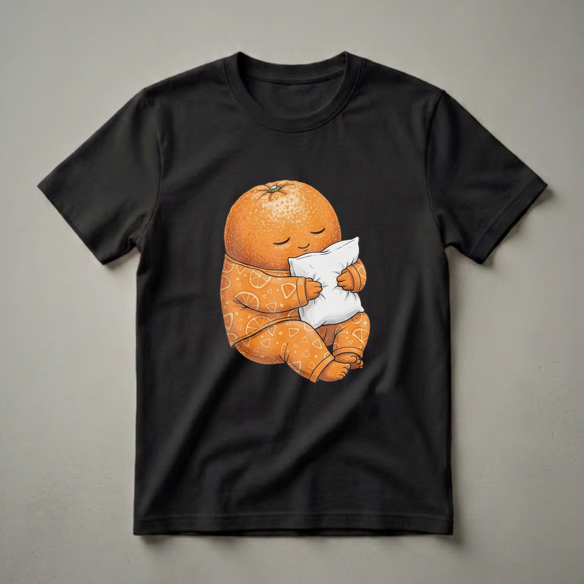 Kids who love cute and funny designs will adore this graphic tee featuring a sleepy orange character. The vibrant orange fruit is depicted wearing pajamas adorned with a pattern of orange slices and small triangles. It's shown with its eyes closed, a gentle smile, and arms wrapped around a fluffy white pillow, embodying a cozy and peaceful slumber. Oranges, a citrus fruit rich in Vitamin C, are known for their refreshing taste and bright color, making them a cheerful subject for apparel. This t-shirt is a delightful choice for children who appreciate whimsical illustrations and enjoy comfortable clothing. It's a wonderful gift idea for birthdays or any occasion for boys and girls who love food-themed graphics or simply need a new go-to tee for lounging or casual wear. Imagine your child reaching for this soft shirt to wear during bedtime stories or lazy weekend mornings. This eye-catching shirt is sure to become a favorite.