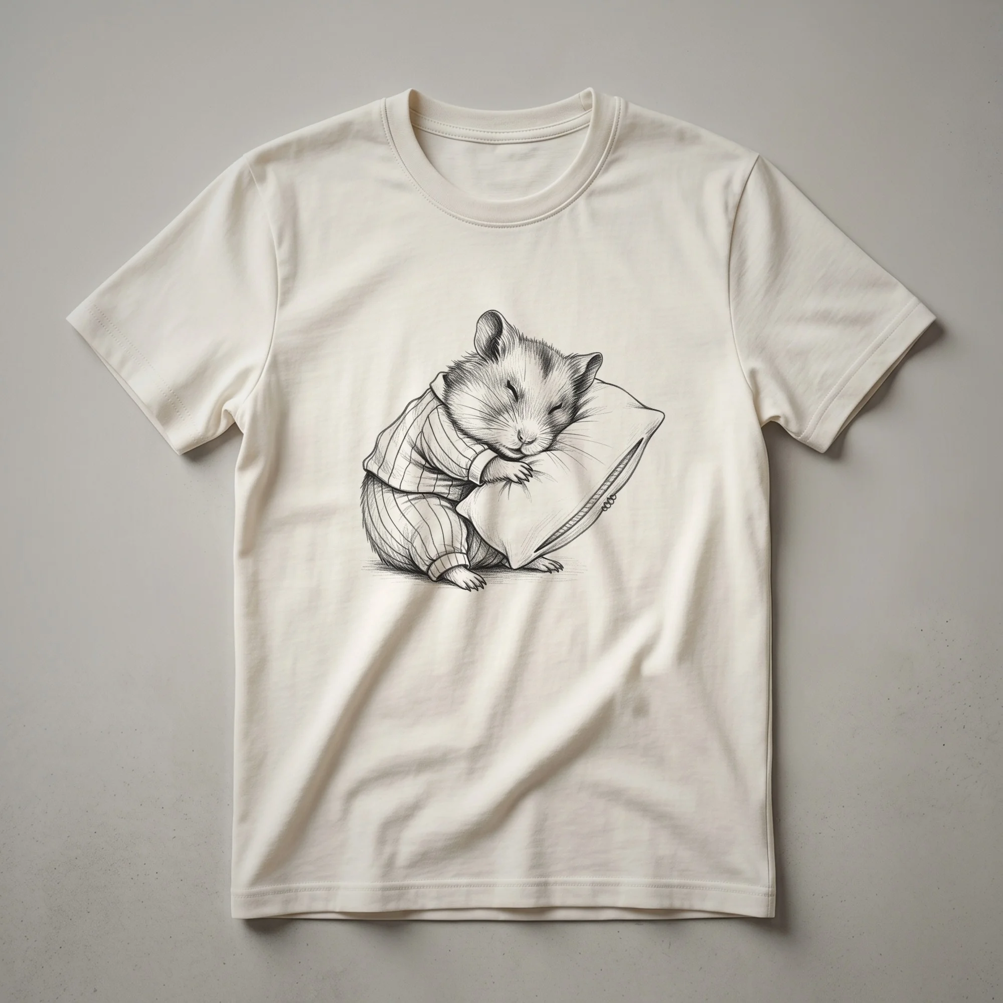 Hamster owners know the charm of these small, nocturnal rodents. This t-shirt showcases a charming, vintage-style drawing of a sleepy hamster nestled in pajamas, capturing the essence of cozy relaxation. Hamsters, native to arid regions of Asia and Europe, are popular pets known for their cheek pouches and burrowing habits. This graphic tee is a delightful way for any hamster mom or dad to express their affection for their furry companions. It's a staple in the collection for those who appreciate the quiet, gentle nature of these small mammals. This shirt works well for casual outings, lounging at home, or as a unique gift for a friend or family member who adores hamsters. Imagine wearing this to a pet-friendly cafe or simply enjoying a quiet evening in, this tee is a conversation starter for fellow animal enthusiasts. The artistic rendering adds a touch of nostalgic appeal, making it a standout piece for any wardrobe.