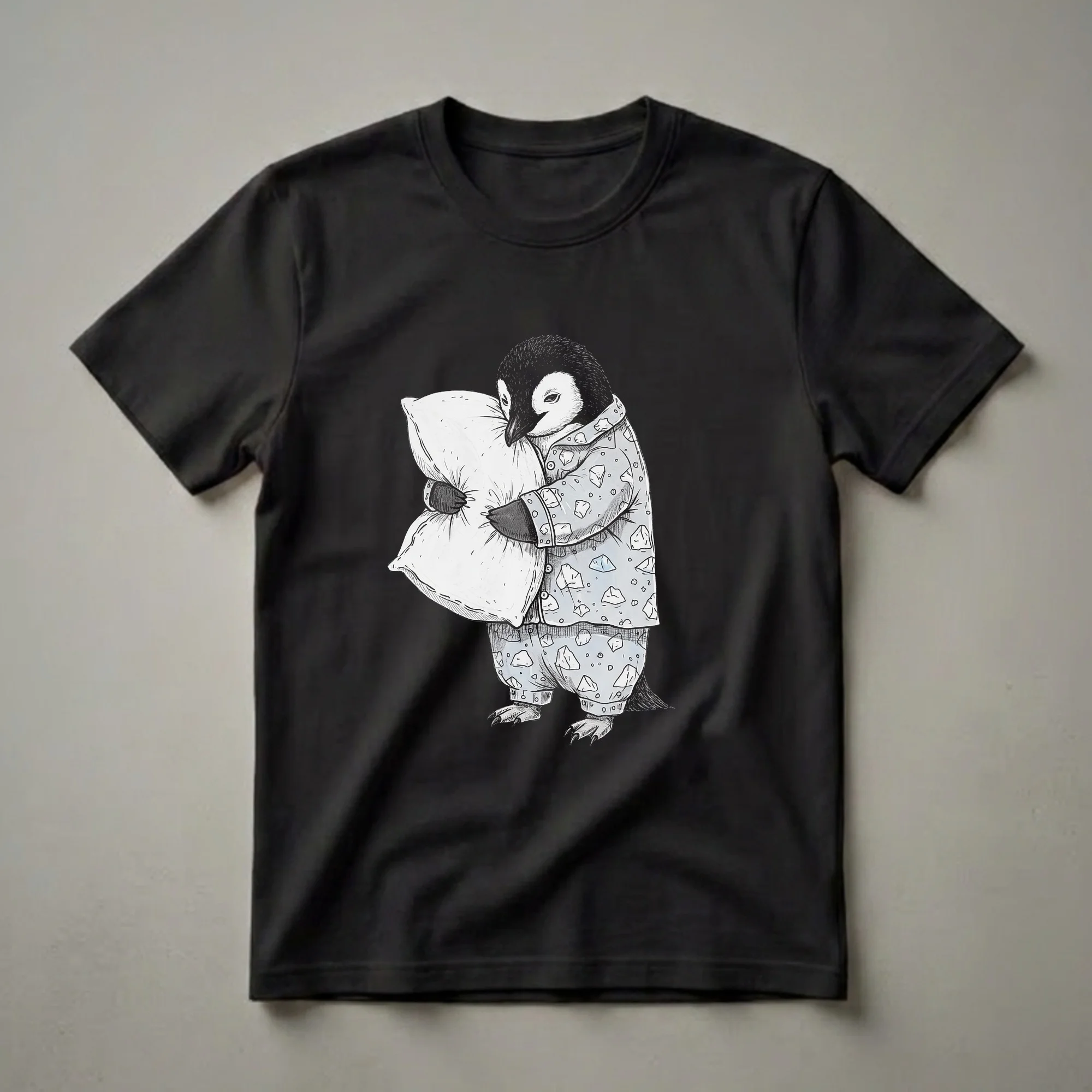 Penguins, known for their distinctive waddle and their habitat in the Southern Hemisphere, are often depicted in charming ways. This graphic tee showcases a particularly endearing scene: a penguin dressed in a light blue pajama set adorned with ice cube patterns, clutching a fluffy white pillow. The penguin's expression is one of pure sleepiness, making this shirt a relatable statement for anyone who cherishes a good night's rest. This t-shirt is a thoughtful gift for penguin enthusiasts, or for anyone who identifies with the desire to curl up and sleep. It's a staple in any collection for those who appreciate a touch of humor and comfort. Imagine wearing this to a casual game night or simply lounging at home. The detailed sketch style brings the sleepy penguin to life, offering a unique visual that stands out. This apparel is a thoughtful choice for women, men, and kids who love a good laugh and a cozy feel. It’s a go-to tee for relaxed evenings and lazy mornings, celebrating the simple joy of sleep.
