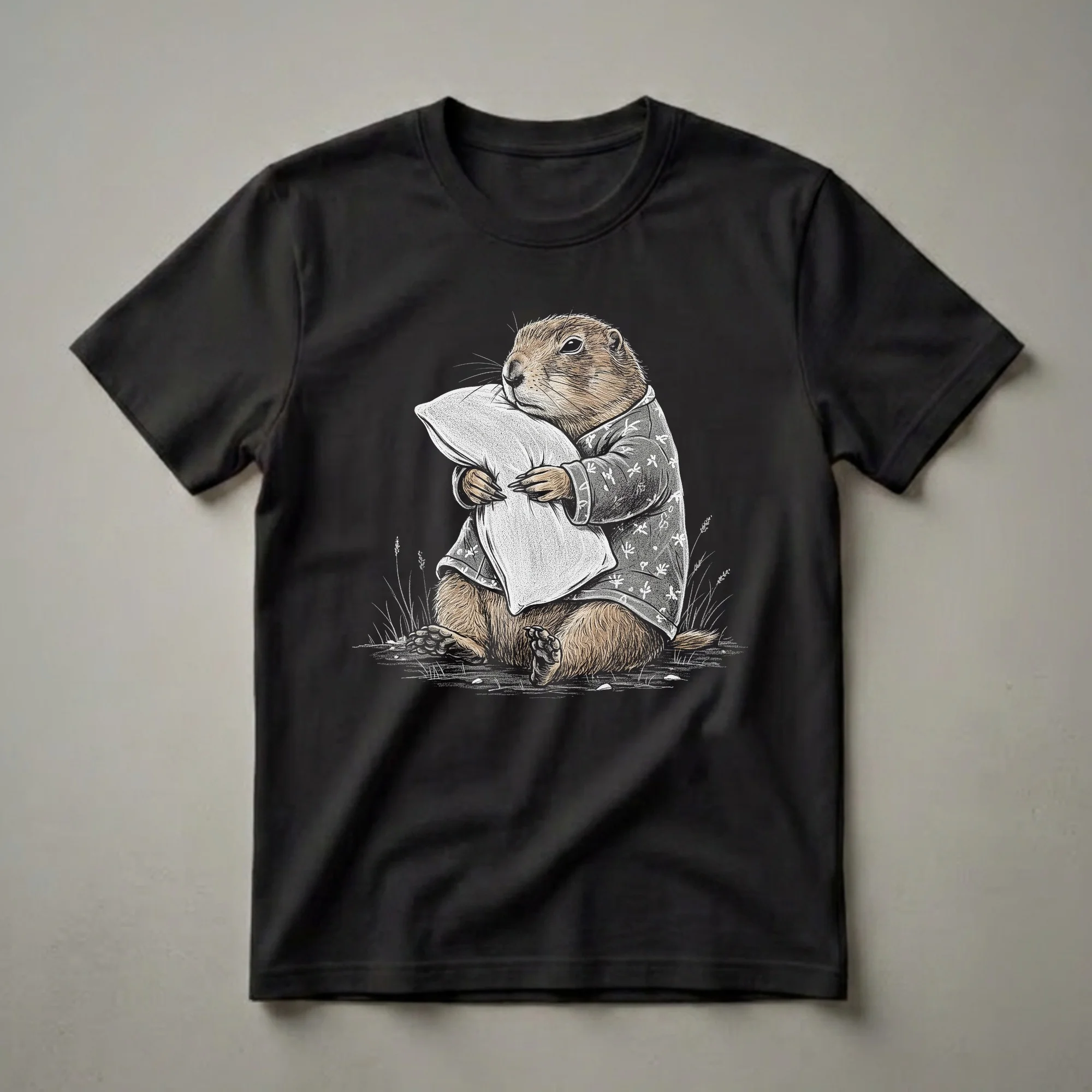 Prairie dog owners and fans of quirky animal apparel will reach for this unique tee. The design showcases a charming prairie dog, dressed in a grey pajama top adorned with small white floral patterns, clutching a fluffy white pillow. Its fur is rendered in warm brown tones, and its paws are delicately placed on the pillow, conveying a sense of deep slumber or a desire for rest. Prairie dogs are social rodents known for their complex burrow systems and communal living, often found in grasslands across North America. This shirt captures a whimsical, anthropomorphic moment, imagining these busy creatures enjoying a moment of quiet repose. It's a thoughtful gift for anyone who appreciates the humor in everyday life or has a soft spot for these fascinating burrowing animals. This comfortable t-shirt is well suited for lounging at home, wearing to a casual get-together, or as part of a fun pajama set. Whether you're a prairie dog enthusiast or simply love a good nap, this graphic tee offers a delightful way to express your personality. It makes a thoughtful gift for friends and family who enjoy unique and humorous animal designs, especially those who understand the universal appeal of a good night's sleep.