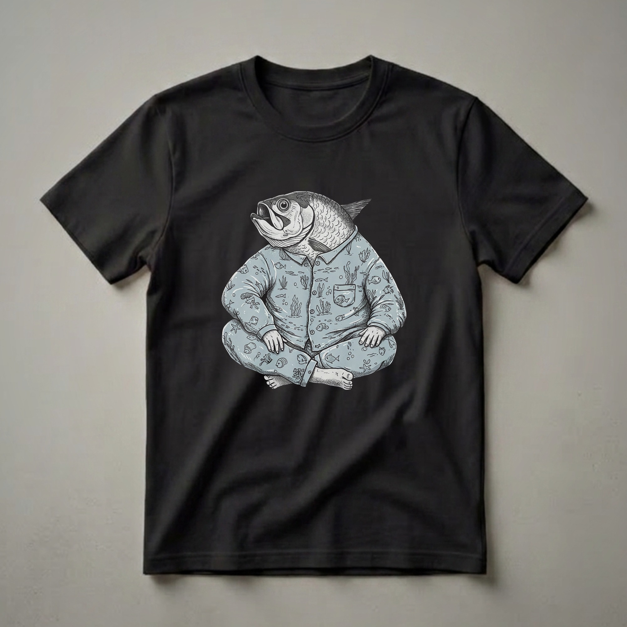 Anglers who appreciate a good laugh will reach for this unique t-shirt featuring a sleepy tarpon fish dressed in pajamas. The illustration depicts a tarpon with its mouth slightly open, appearing relaxed and ready for a nap, seated in a meditative pose. The light blue pajama set is adorned with a whimsical pattern of various sea creatures, including smaller fish, starfish, and seaweed, evoking a serene underwater scene. Tarpon, known for their impressive size and acrobatic leaps when hooked, are a prized catch for sport fishermen, particularly in saltwater environments along the Atlantic coast and in the Gulf of Mexico. This graphic tee is a thoughtful gift for the fisherman in your life who enjoys both the thrill of the catch and the quiet moments of relaxation. It’s a comfortable and conversation-starting piece of apparel, great to wear around the house, to casual gatherings, or even on a fishing trip when you want to share a smile. This shirt celebrates the angler's passion with a touch of humor and a nod to the majestic tarpon.