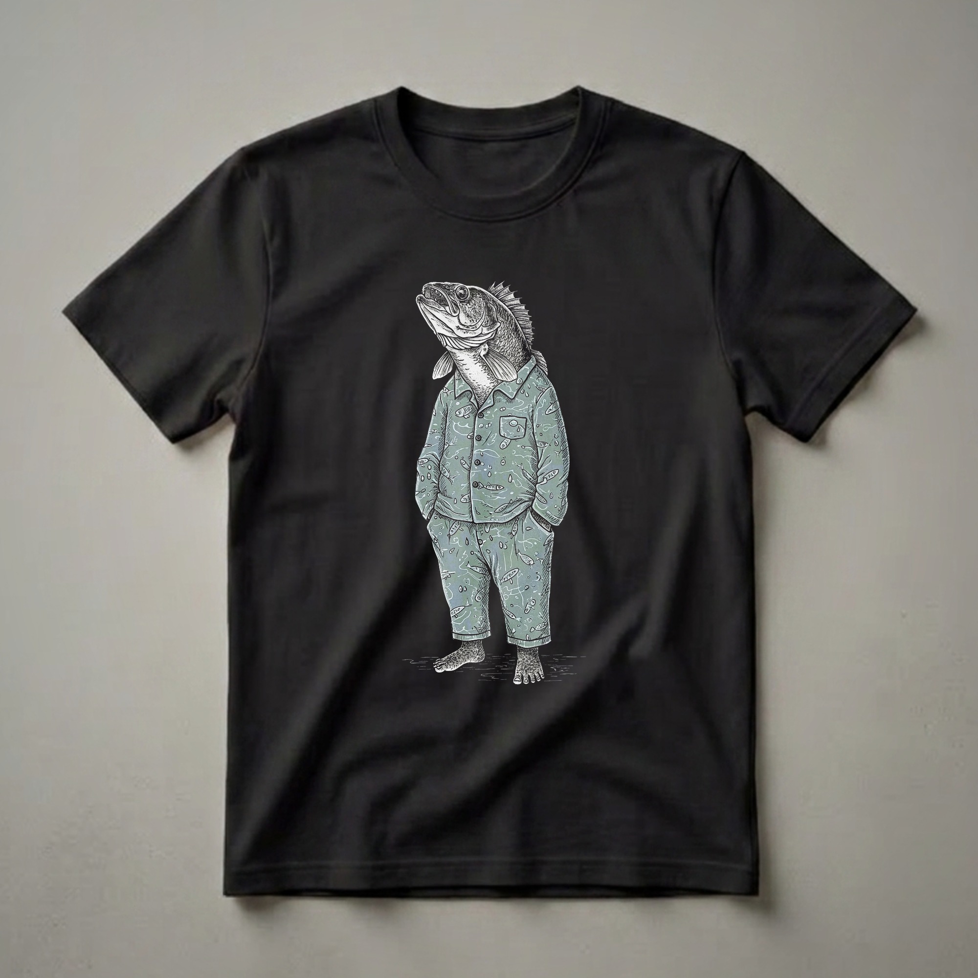 Anglers who appreciate a good laugh will reach for this unique t-shirt featuring a sleepy walleye fish dressed in a pajama set. The detailed sketch showcases the fish's head and torso emerging from a collared pajama top, complete with buttons and a chest pocket. The pajama bottoms are adorned with a repeating pattern of small fish and water ripples, adding to the whimsical design. Walleye, known for their keen eyesight and preference for murky waters, are a popular sport fish in North America, often found in large lakes and rivers. This eye-catching graphic tee is a thoughtful gift for the fisherman in your life who enjoys a bit of humor with their passion. It's a comfortable and conversation-starting piece, worn by those who love to relax around the house on a lazy morning or at their next fishing trip gathering. This shirt celebrates the angler's dedication, even during downtime, with a touch of playful personality. It’s a staple for anyone who loves to cast a line and dreams of the big catch.