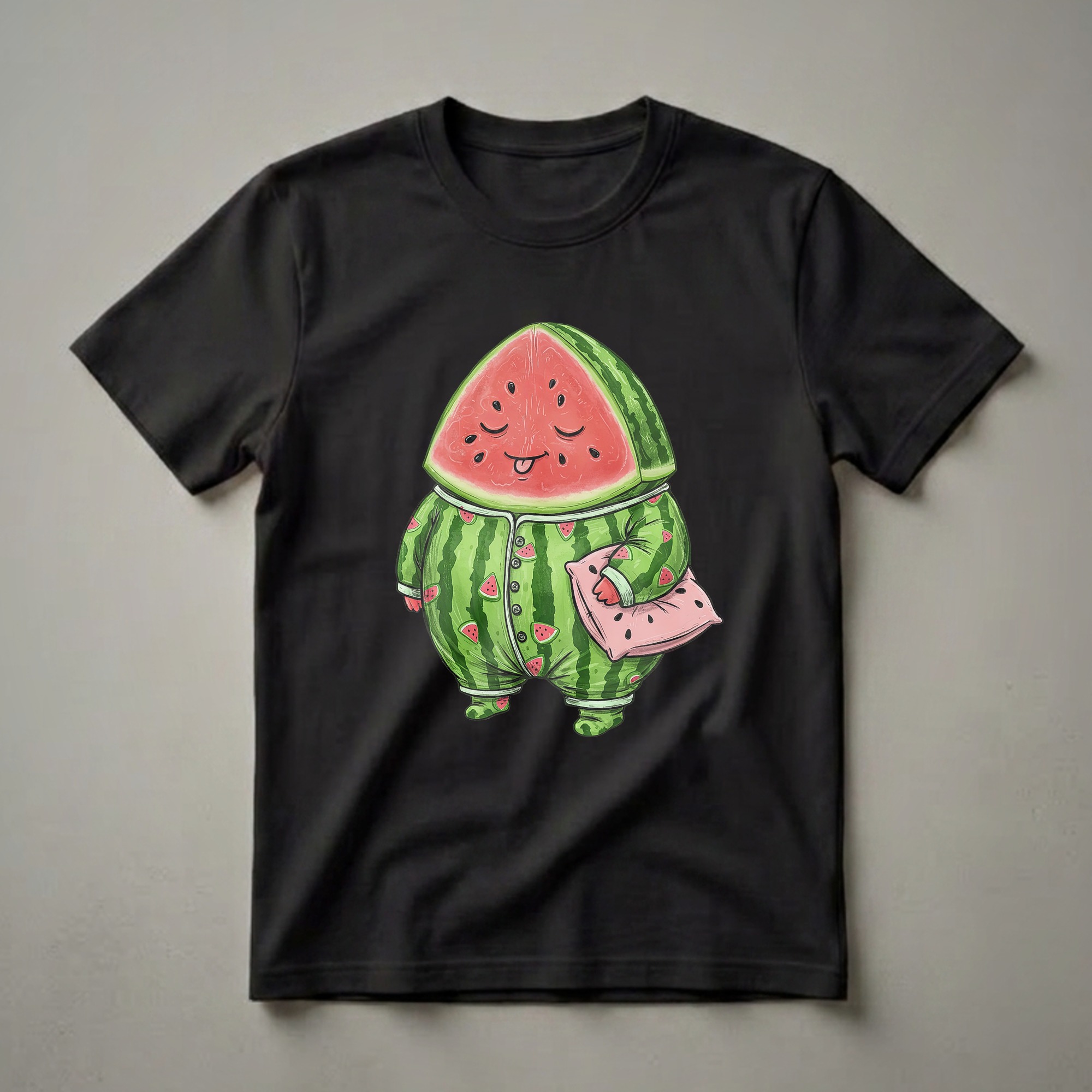 Kids who love fruity fun will reach for this adorable watermelon pajama tee. The graphic showcases a plump, sleepy slice of watermelon dressed in green striped pajamas adorned with smaller watermelon slices. Its eyes are closed, and its tongue is playfully sticking out, while it clutches a pink pillow patterned with watermelon seeds. This shirt is a thoughtful gift for any child who enjoys whimsical designs and cozy loungewear. Watermelons, scientifically known as Citrullus lanatus, are juicy, sweet fruits that thrive in warm climates, making them a symbol of summer. This t-shirt works well for children who appreciate playful characters and vibrant fruit imagery. It's a delightful choice for bedtime stories or lazy weekend mornings, bringing a smile to any young wearer. This fun pajama shirt is a staple for any kid's casual wardrobe.