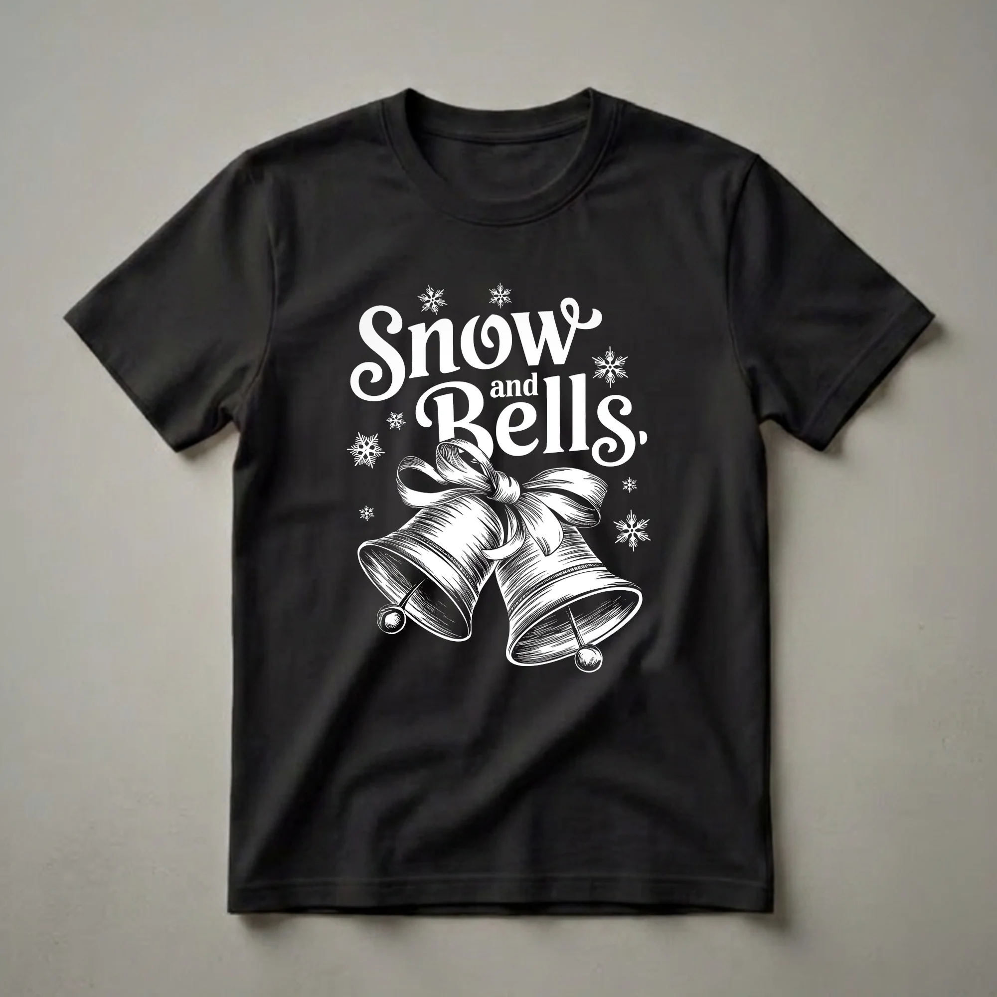 - Festive "Snow and Bells" Christmas graphic tee for families.