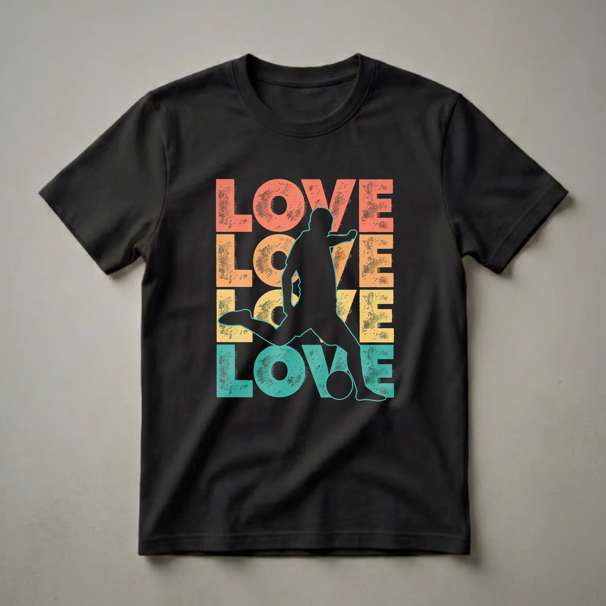 Soccer players who live and breathe the sport will reach for this eye-catching graphic tee. The design features a dynamic silhouette of a soccer player in action, mid-kick, set against a backdrop of the word 'LOVE' stacked vertically. Each letter of 'LOVE' is presented in a different distressed, retro-inspired color: coral, orange, yellow, and teal, creating a vibrant and energetic visual. This shirt is a thoughtful gift for any soccer enthusiast, coach, or player who wants to showcase their dedication to the beautiful game. Wear it to the next match, practice, or casual outing to express your love for football. The bold typography and athletic imagery make this t-shirt a standout piece for any soccer fan's wardrobe, celebrating the passion that drives players on and off the field. It’s a staple in the collection for anyone who understands the thrill of the game.