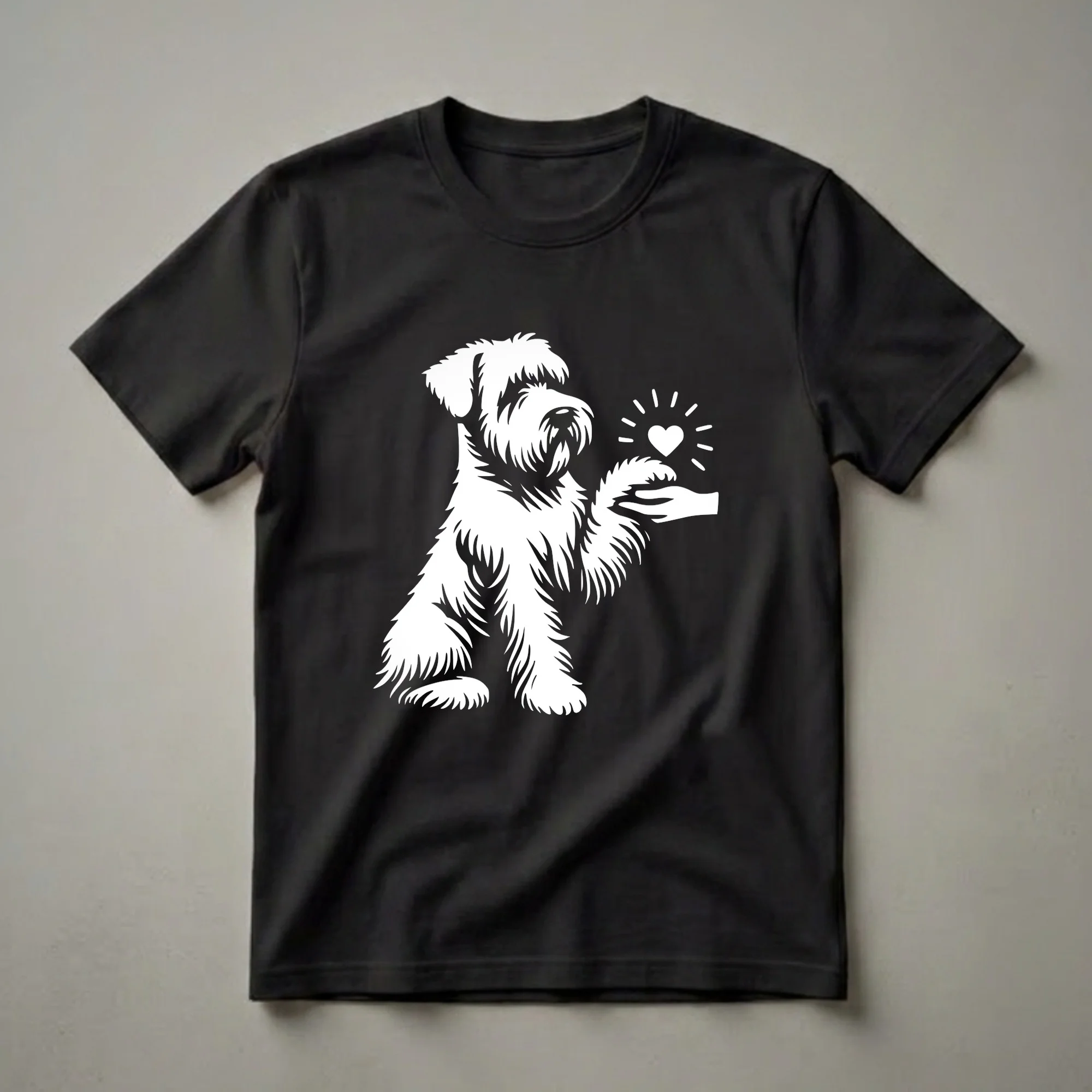 Soft Coated Wheaten Terrier owners who want to showcase their affection for their spirited companions will reach for this eye-catching graphic tee. The design features a stylized white stencil of a Soft Coated Wheaten Terrier, a breed known for its friendly and energetic nature, sitting attentively. In a tender gesture, the dog extends its paw, offering a glowing heart to a waiting hand. This visual metaphor perfectly captures the deep bond between a dog and its human. The Soft Coated Wheaten Terrier, originating from Ireland, is recognized for its distinctive soft, wavy coat and its joyful, outgoing personality. This t-shirt works well for anyone who understands the unconditional love a Wheaten brings into a home. It makes a thoughtful gift for a birthday, holiday, or just because for the Wheaten mom or dad in your life. Wear this shirt to dog parks, casual outings, or while relaxing at home with your beloved furry family member, celebrating the special connection you share.