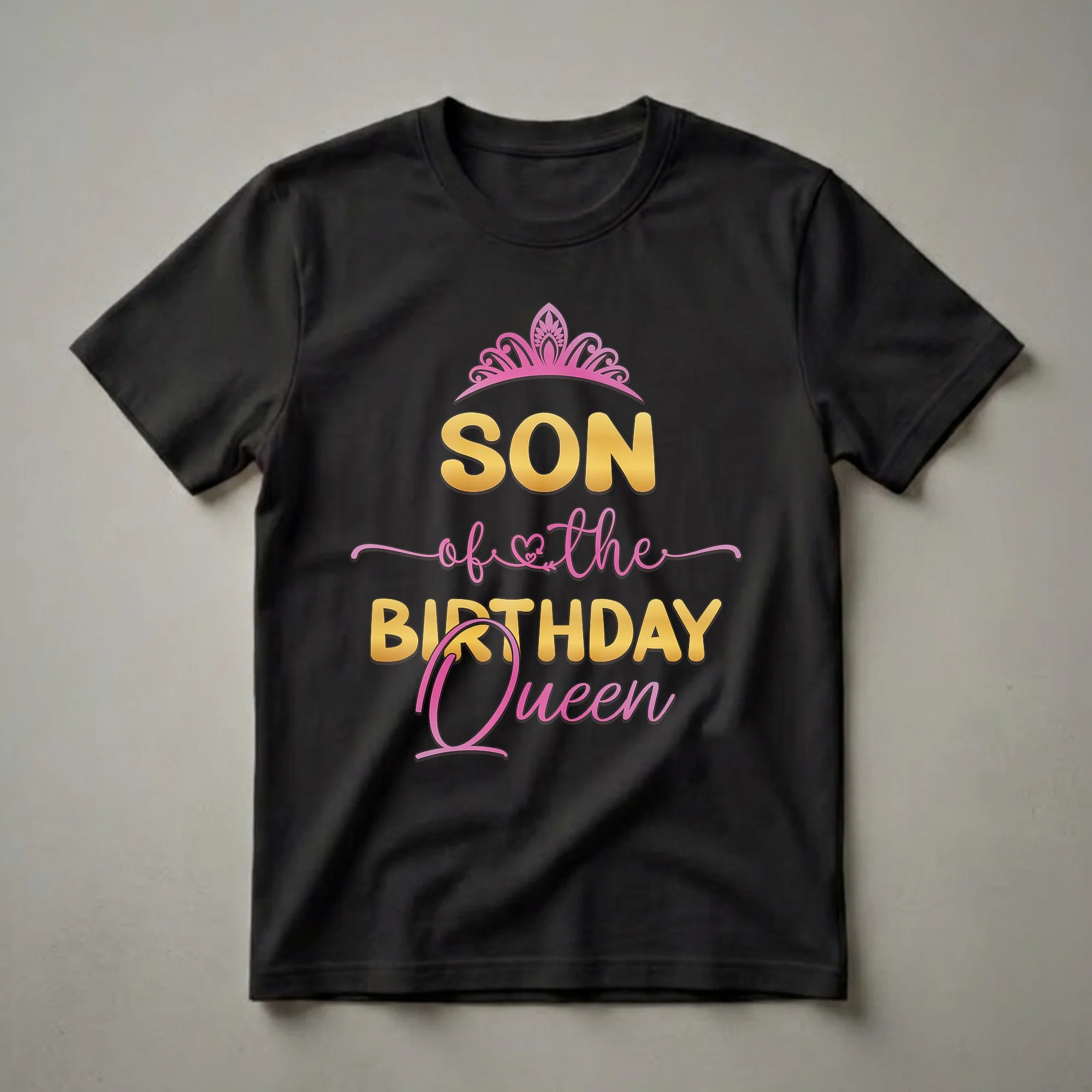 Sons who want to show their love and support for their mom on her special day will reach for this eye-catching graphic tee. The design features a vibrant pink crown atop bold, golden lettering that proudly proclaims 'SON of the BIRTHDAY Queen'. This shirt is a fantastic way for any son to acknowledge his mother as the star of her birthday celebration, whether it's a milestone birthday or just another year of fabulousness. It's a thoughtful gift idea for sons looking to make their mom feel extra special. Imagine him wearing this t-shirt to her birthday brunch, dinner, or any party thrown in her honor. It's a fun piece of apparel that sparks conversation and brings smiles. This tee is a staple for any son wanting to join in the birthday festivities and celebrate the queen of the day. It's more than just a shirt; it's a declaration of pride and love for the birthday matriarch. This graphic tee is a go-to choice for sons who want to participate in the birthday fun and honor their mom's special occasion with a touch of playful style.
