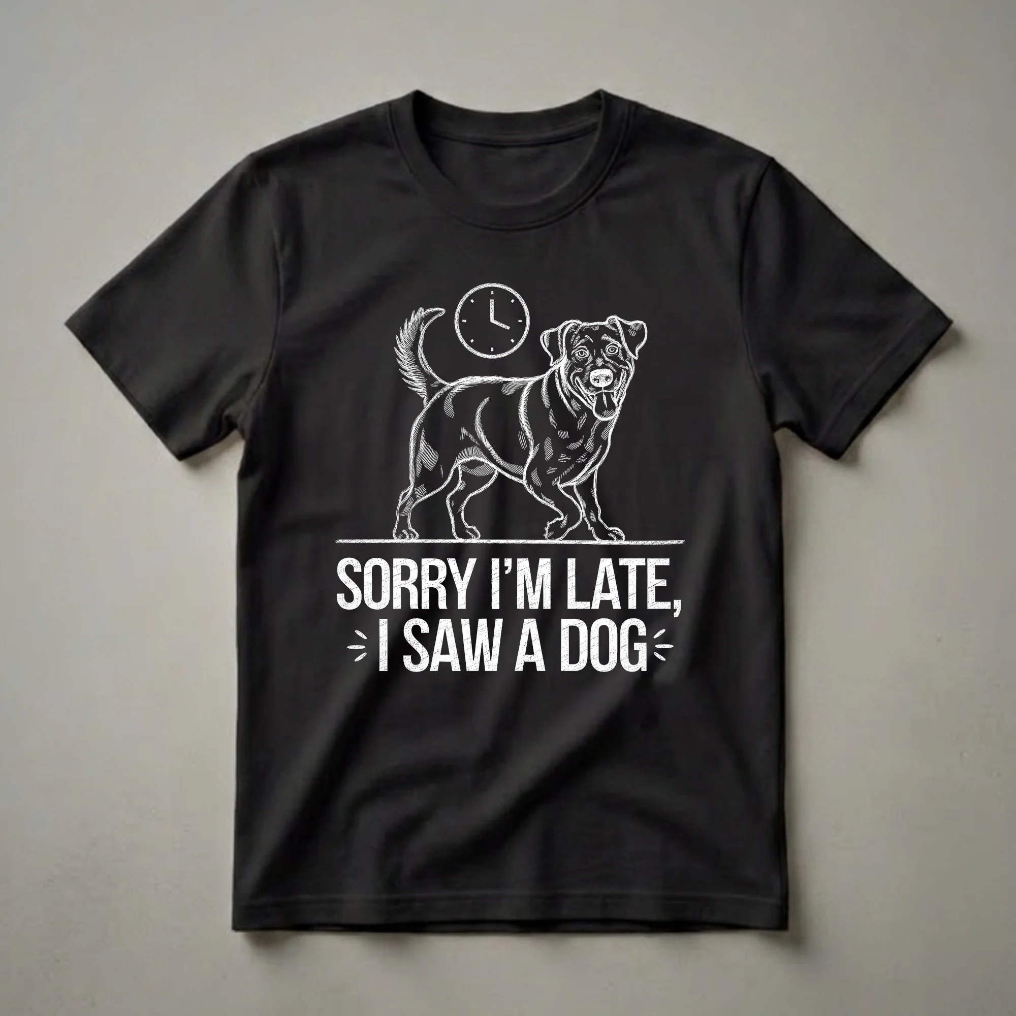 Dog moms and dog dads know the irresistible pull of a furry friend, often leading to unexpected delays. This graphic tee captures that sentiment with a playful design. The artwork showcases a stylized dog, rendered in a white sketch style against a black background, with a clock overhead indicating the passage of time. Below the image, the bold text reads, "SORRY I'M LATE, I SAW A DOG." This shirt is a staple in the collection for anyone who understands that a dog's presence can make any schedule flexible. It's a thoughtful gift for the dog owner in your life who frequently finds themselves distracted by their canine companion. Wear this tee to casual outings, dog park visits, or just lounging at home, celebrating the joy dogs bring into our lives. The design speaks to the universal experience of dog lovers who prioritize their pets' company. This t-shirt is a fun way to express your love for dogs and your understanding of their captivating charm.