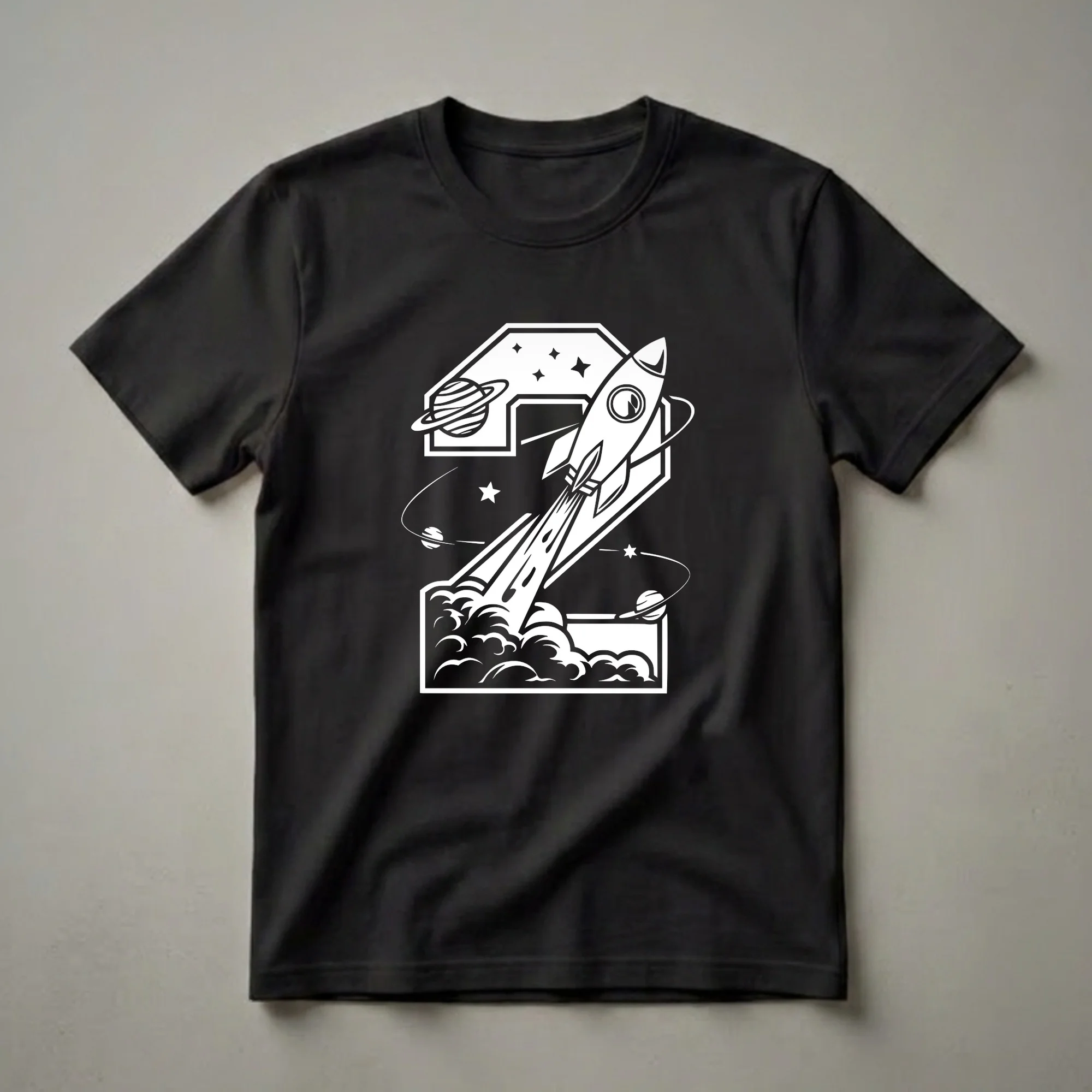 Two-year-olds are embarking on their own cosmic journey of discovery, and this space-themed birthday tee captures that adventurous spirit. The graphic showcases a stylized number '2' as the backdrop for a dynamic scene. A retro rocket ship blasts off from a cloud of smoke, leaving a trail of fiery exhaust as it ascends into a starry expanse. Orbiting planets, one with prominent rings, add to the celestial atmosphere. This shirt is a thoughtful gift for any child turning two who is fascinated by space, rockets, and the wonders of the universe. It's a great way to commemorate a significant milestone birthday. Imagine your little astronaut wearing this t-shirt to their birthday party, sparking conversations and smiles. This eye-catching design makes a memorable keepsake for a special second birthday celebration, a thoughtful choice for toddlers who are just beginning to explore the world around them. This graphic tee is a fun addition to any young child's wardrobe, celebrating their growth and imagination.