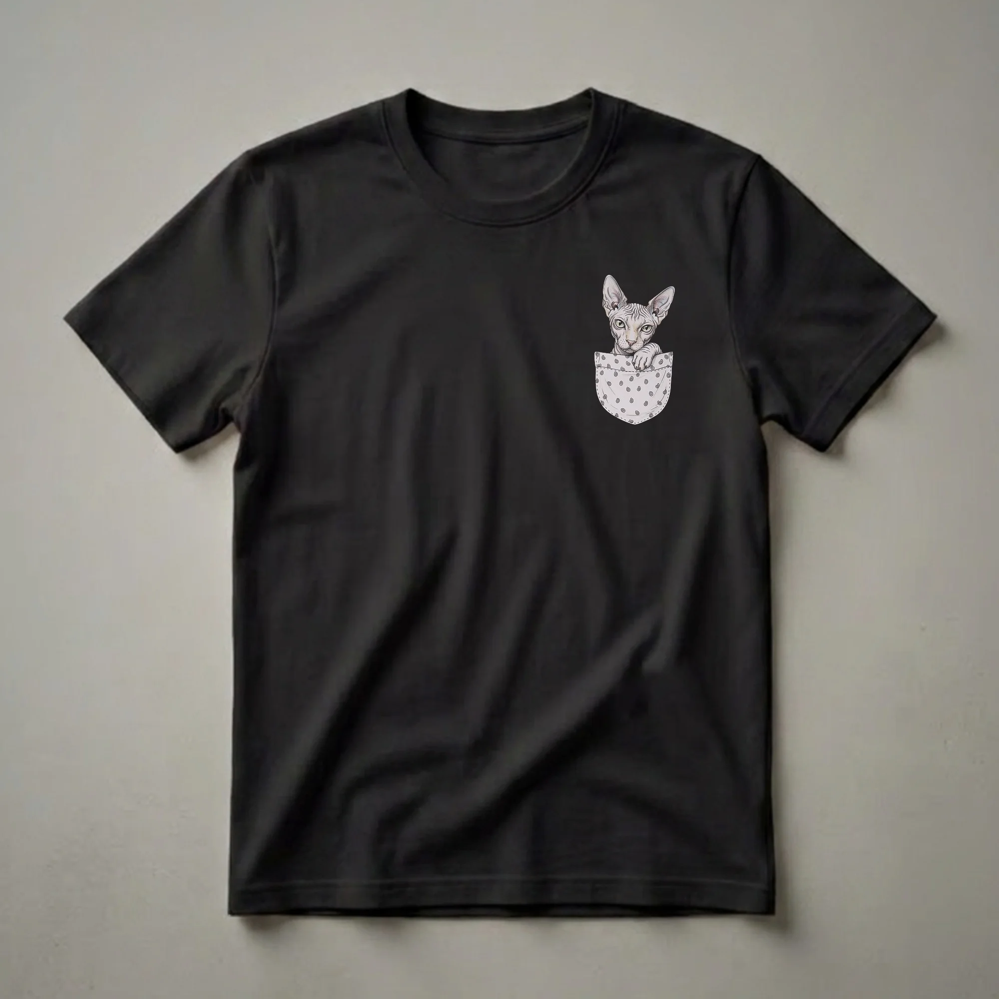 Cat moms and dads who adore the distinctive look of the Sphynx breed will reach for this eye-catching graphic tee. The artwork features a detailed, hand-drawn illustration of a Sphynx cat peeking over the edge of a pocket. The pocket itself is adorned with a subtle, repeating pattern of small circles, adding a touch of vintage charm to the design. Sphynx cats, known for their hairless appearance and wrinkled skin, are a breed that captivates with their unique beauty and affectionate personalities. This shirt is a wonderful way to express your appreciation for these special companions. It makes a thoughtful gift for any Sphynx cat owner or a general cat enthusiast who enjoys unique and artistic apparel. Wear this tee to casual outings, cat-themed events, or simply while relaxing at home with your feline friends. It’s a conversation starter and a clear declaration of your love for these fascinating creatures. This t-shirt is a staple in the collection for anyone who appreciates the unconventional elegance of the Sphynx.